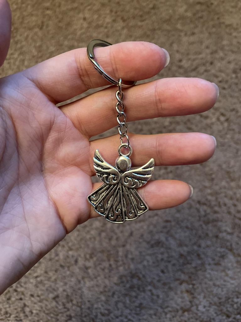 Небольшой плоский металлический брелок ангелочек.Качеством довольна.
