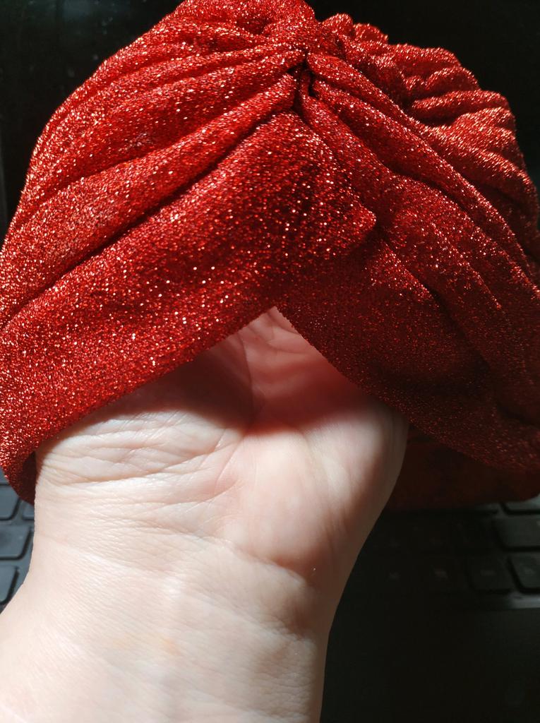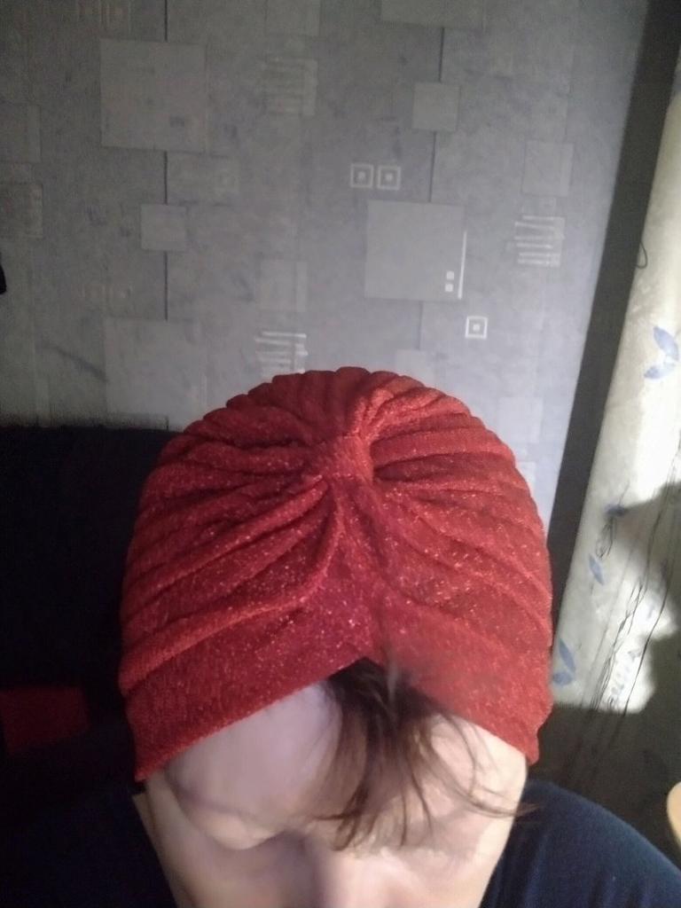 Шапочка тонкая с люрексом, фасон чалмы, смотрится неплохо. На улицу ее конечно не оденешь, дома или на даче можно, на утренник как чалму вполне. Кто то может одеть после мытья головы, чтобы волосы с утра имели более опрятный вид. Кому идёт фасон чалма, вполне может ее использовать и от солнца на пляже, т.к. люрекс имеет свойство отражать лучи.