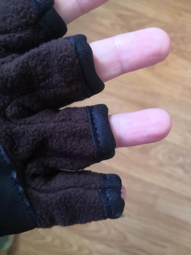 9 сент оплатила, 12 окт посылочка пришла на почту. Отслеживалась. 2 покупки с перчатками положили в одну. Носить конечно буду, но без удовольствия. Пошиты нормально. Немного торчат нитки, не критично. Не нравится, что очень широкие. Большой палец, когда открываешь, липучки пришиты далеко и при отвороте одна с другой не совпадают. И мизинец затерялся.
