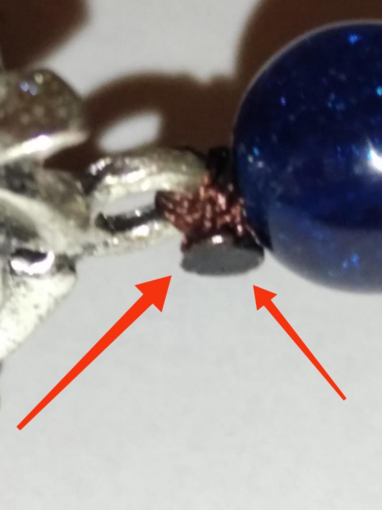 На кулоне в том месте , где идёт соединение бусины и металлического кольца - узел шнура завязан и оплавлен на лицевой стороне . Этот узел надо было сделать на изнаночной стороне подвески : Хотелось бы , чтобы всё это было соединено так , как на фото продавца: то есть , лицевая сторона была красиво сделана за счёт того , что этот узел крепления был на изнаночной стороне :