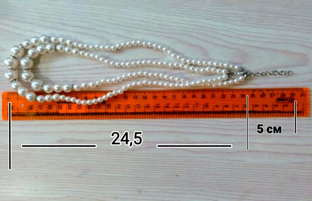 Бусы из искусственного жемчуга, двухслойные. Две нитки соединены между собой надёжным карабинчиком. Длина большей 48 см Меньшая-42 см, чуть не дотягивают до заявленных сантиметров. Между бусинами серебристые вставки, очень красивое дополнение, бусинки смотрятся великолепно. Для меня жемчуг всегда модная классика, заслуживающая большого внимания. Доставка в сборной посылке пять недель, упаковка хорошая, продавцу спасибо за чудесный товар.