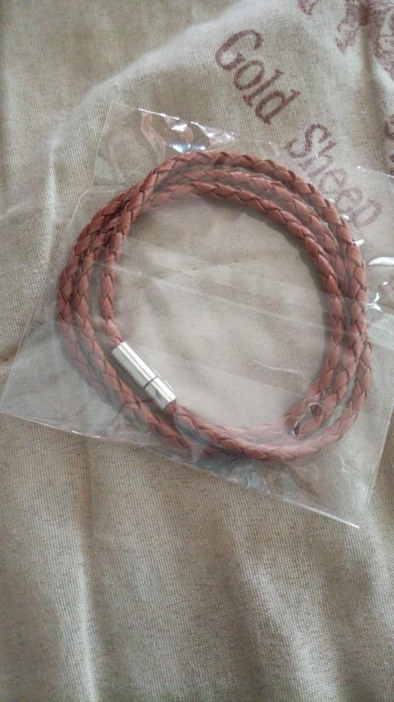 Шнур их неплохого кожезаменителя, замочек закрывакется надёжно. Можно носить и как браслет, и как шнурок для подвески. Всё бы хорошо, но цвет не имеет ничего общего с заявленым продавцом в описании и на фото. Не тёмно-коричневый, а рыжевато-песочный, китайские торговцы называют его обычно "верблюд". Я уже начинаю привыкать, что можно брать только чёрные вещи, остальные цвета совершенно рандомны. Ну, не фиолетовый в розовую и зелёную полосочку и на том спасибо.