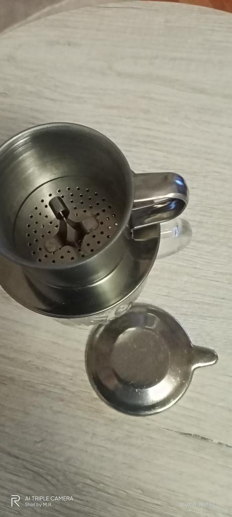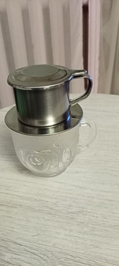 Вьетнамский фильтр кофе 19.09🔜2.10 Переносной заварник для натурального молотого кофе - визитная карточка Вьетнама. Многие привозят его оттуда в качестве сувенира, но я нашла такой и на просторах Джум. Приспособление крайне простое. Ставите заварник на чашку, засыпаете молотый кофе (желательно крупный помол), придавливаете крышечкой, заливаете кипятком и накрываете крышкой. Пока занимаетесь своими делами - в чаше капелька за капелькой будет появляться ваш кофе😉 Удобно брать с собой на работу и поездки, нужен всего лишь кипяток. На ручке оказался брак метала, и петля крышечки немного согнута. На функционал совершенно не влияет, но вид портит. В целом за свою цену рекомендую. Отдельный плюс за быструю доставку!