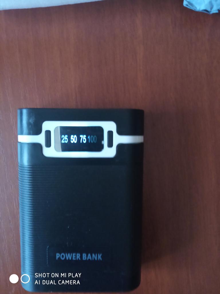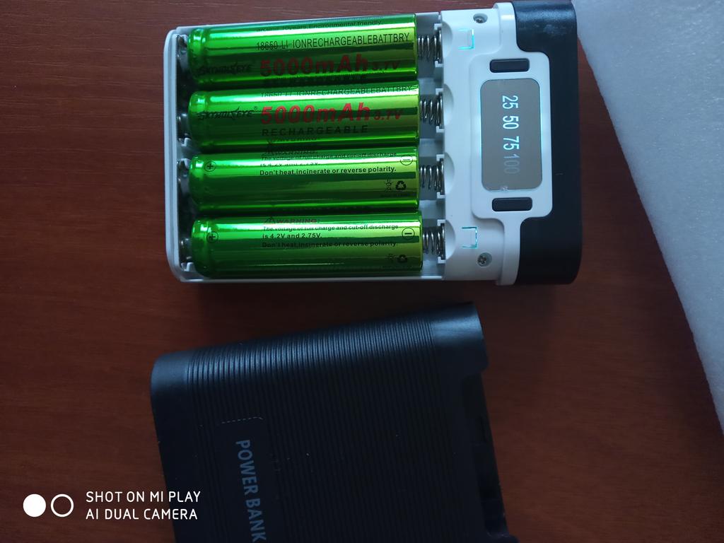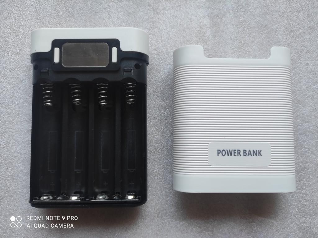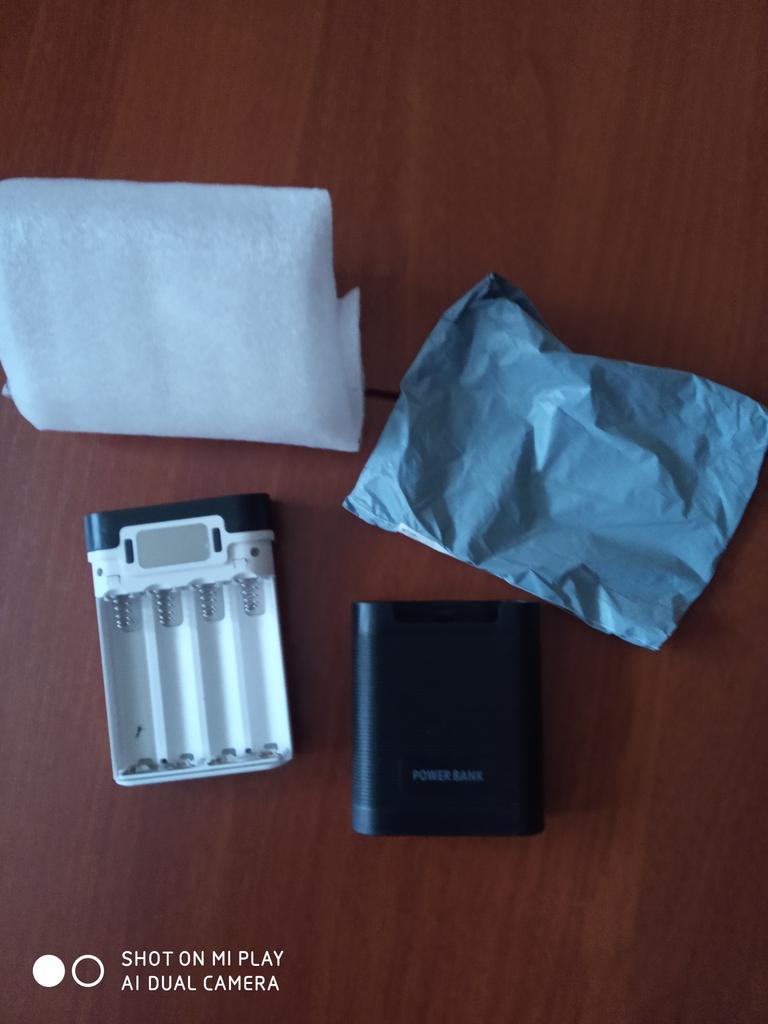 Доставка в Украину 3 недели. Упакован был вместе с другим банком в индивидуальный тонкий целлофан + общая упаковка во вспененном полиэтилене. При открытии посылки сразу же бросилось в глаза: стекло поцарапано, виден брак от лишней покраски (на фото видно). Пластик корпуса довольно толстый, не гнется. Плата спрятанна отдельно от батарейного отсека. Доступ к самому батарейному отсеку довольно простой. По габаритам небольшой, но всего на 4 батареи. Можно использовать данный девайс в качестве подзарядки аккумуляторов. Вход: 1 х micro-USB; Выходы: 2 х USB по 5В. Рабочие оба. Хоть и указано, что один из них 1А, второй 2А, но по факту они оба на 2А (скорее всего просто в параллели). Контроллер заряда нужно протестировать. При 4В показывает всего 50%.