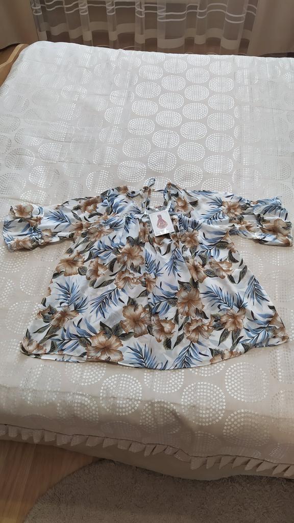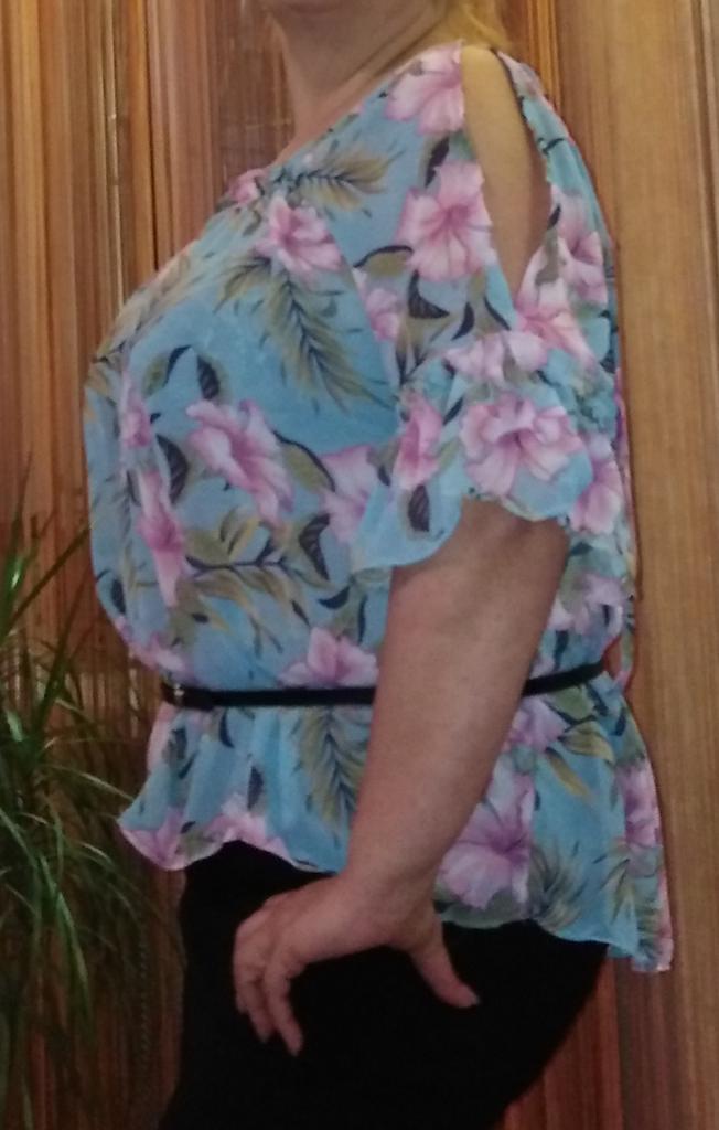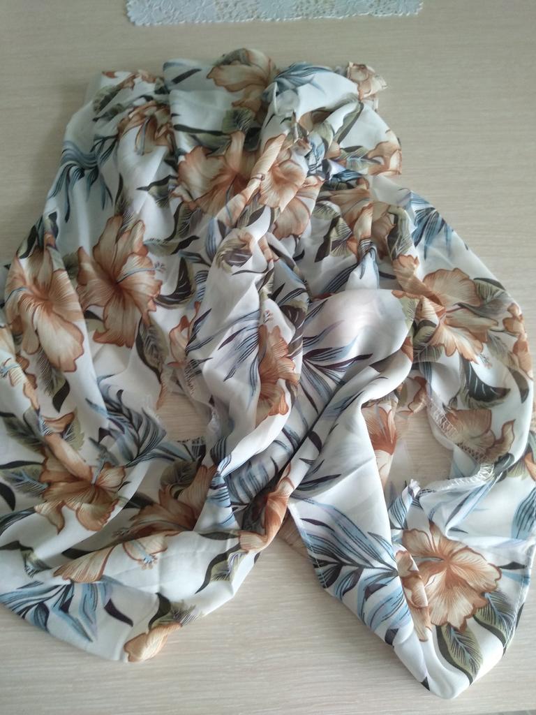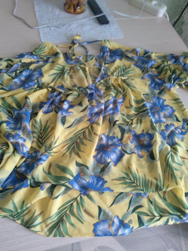 Блузка сшита неплохо, но ткань тонюсенькая, на фото выглядит как будто плотнее. Размер на 50-52 свободно, но на лето самое оно. Цвет намного беднее, чем на картинке. Есть небольшой запах, но не критично, как у всех новых вещей. Без пояска будет развеваться на ветру. В общем, на троечку.