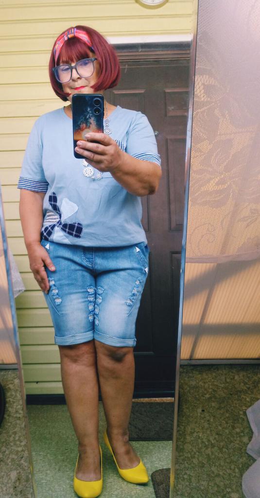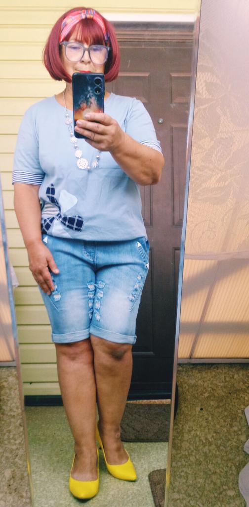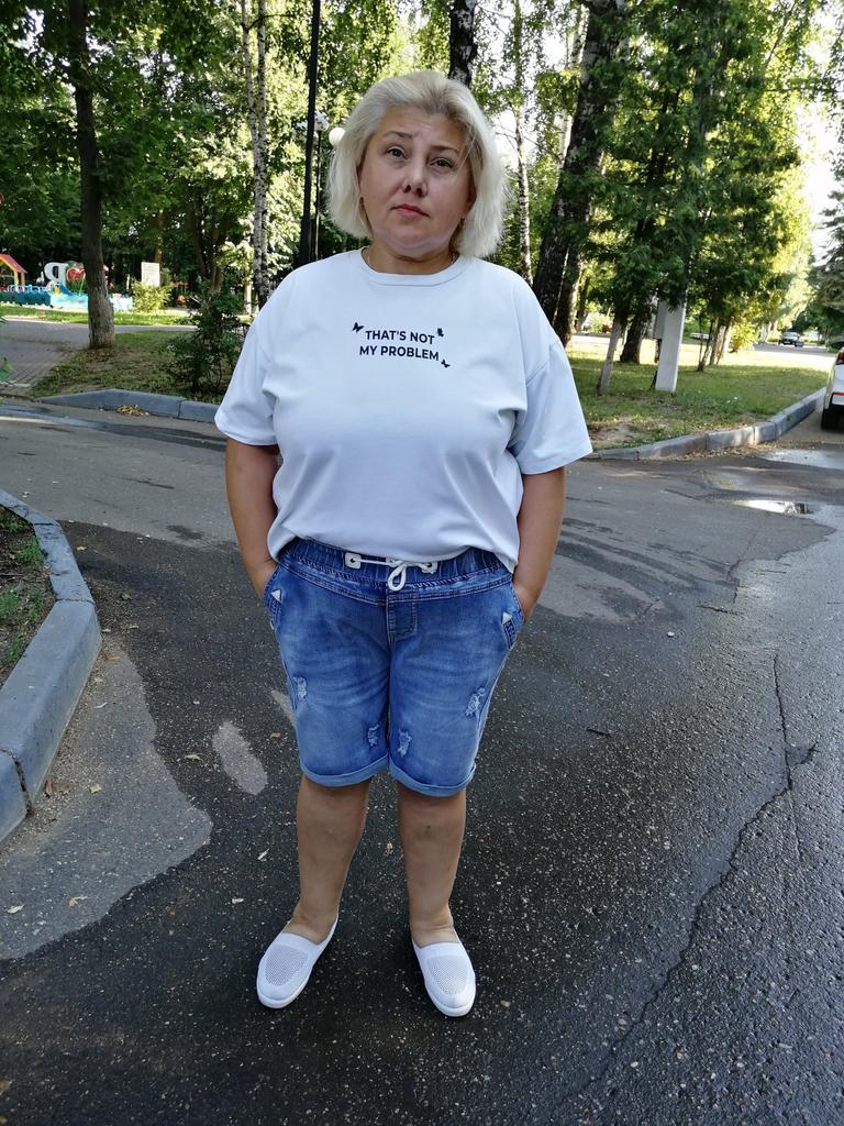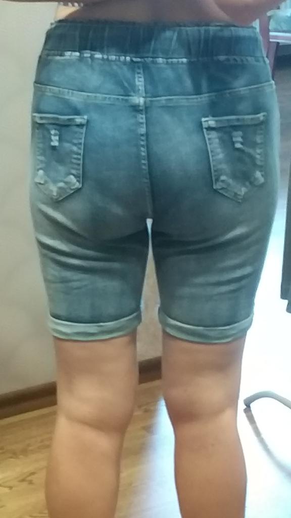 Джинсовые шорты. Шорты замечательные, хорошо тянутся, вверху на резинке, шнурком можно отрегулировать нужную ширину., что очень удобно. Имеются карманы впереди и сзади. Это уже вторые шорты. Первые заказала голубые и они мне так понравились, что решила приобрести ещё одни в другом цвете. На этот раз заказала 4Х (ОТ 85 см, ОБ 114 см, рост 154 см) Первые голубые были 3Х. По длине 4Х оказались на 1 см короче. Шорты рекомендую. В них очень комфортно, нигде ничего не жмёт, не давит.