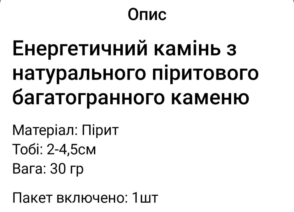 Доставка посылки быстрая 17 дней, в посылке три заказа. Натуральный пирит не соответствует описанию и картинкам продавца. В описании указан вес 30 грамм, мне прислали с весом 14 грамм; по размеру соответствует 2,3см (2-4,5см); мне попал экземпляр, в котором есть изъян (мышь серая канаву прогрызла, на фото хорошо видно); при сканировании приложением показывает пирит, хотя по цвету серебристый, не такой жёлтый, как на картинках продавца. Спасибо Joom за быструю доставку. Закажу в этого продавца ещё раз пирит, буду надеяться, что заказ будет без проблем, соответствовать описанию и картинкам продавца.