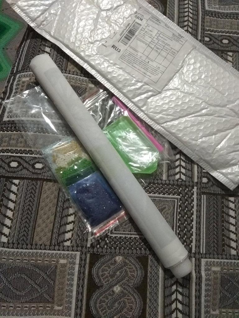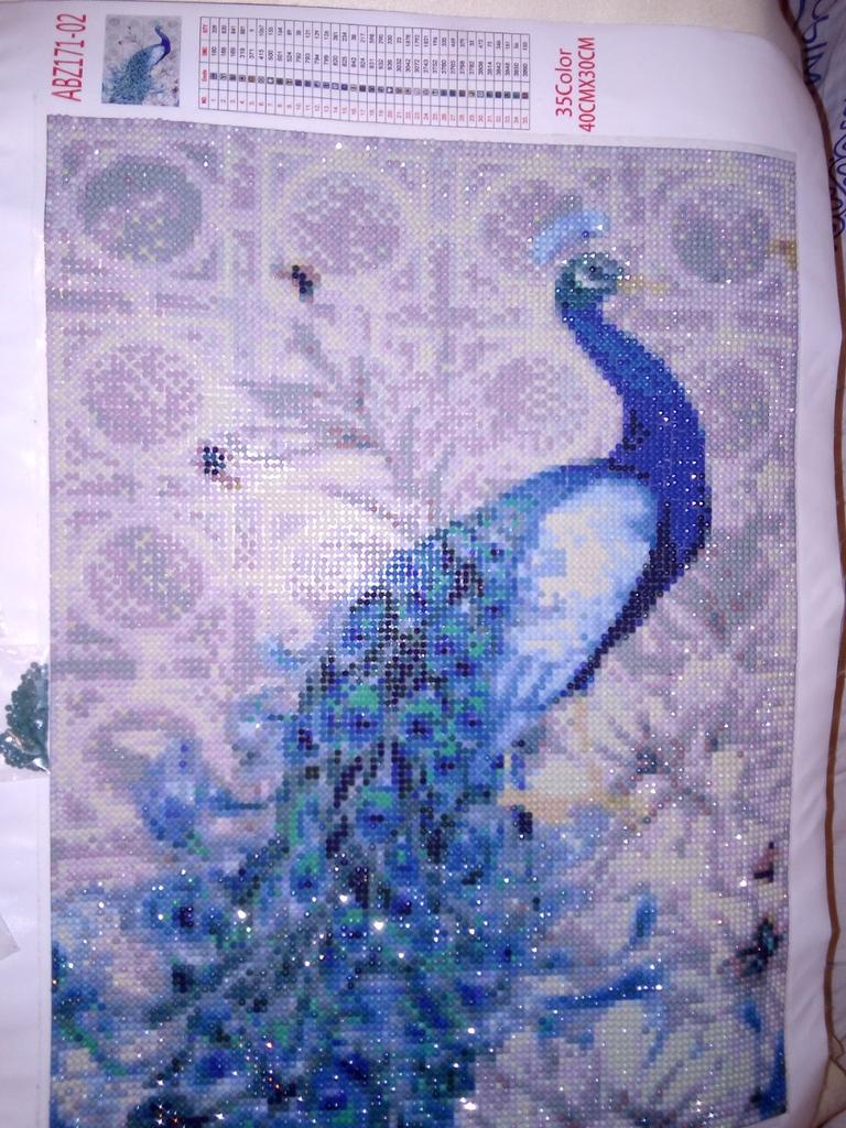 40 дней шла посылка. Свернуто с заломами. На этой картине павлин очень грустный. Выкладывается только птица в углу. Вся остальная картина серая, невзрачная. Мне не понравилась. Павлин птица гордая, а эта унылая. Выбирайте другой вариант. Не то я выбрала такую, не то прислали не то. Жаль, что серый фон без липучки, можно было бы оставшимися от других картинок стразиками выложить. Нужен специальный клей.
