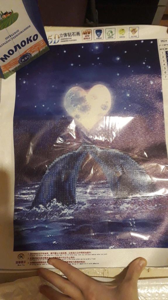 Картинка красивая, но думала, что вся выкладывается, оказалось, что только дельфины. Не критично. Упаковано хорошо, картинка свернута в рулон на мягкую трубку. Страз много.