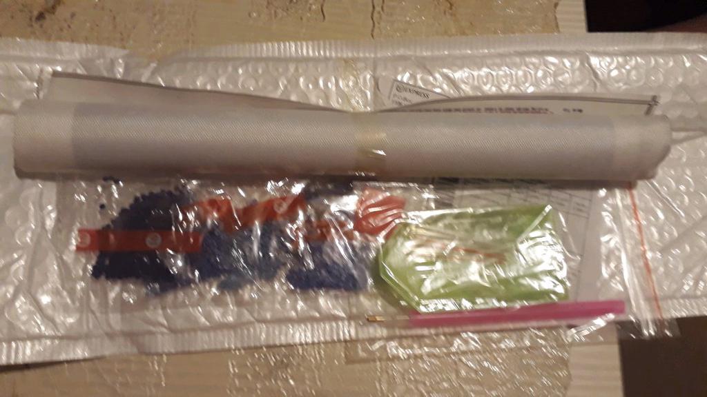 Посылка пришла в С-Пб за 1 месяц и 3 недели. Упакована хорошо,в почтовый пакет с пупырками. Сама картина намотана на паралоновый валик и перемотана скотчем. Выкладываются только дельфины.