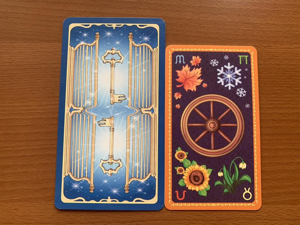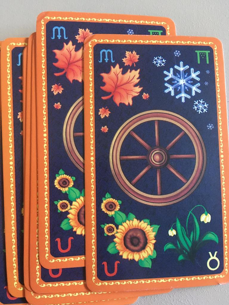 Пришли вместе с другими картами в одной упаковке. Рисунки очень нравятся, очень приятная рисовка. Ну я конечно более-менее знала, что заказываю, но видеть в реале - это совсем другое. Единственное, пришло с дефектом, специально сфоткала помятый угол коробки и это отразилось на картах, как видите, из-за этого уголок нескольких карт замят. Но это уже по любому вина не продавца, а те кто занимается доставкой, кидает все как попало вот и помяли. А так нареканий нет, рубашка приятная, сами карты хорошего размера - не мини-формат, но и не те, которые в руку не помещаются, что аж держать трудно (и такие имеем). Так же они не очень толстые и жёсткие, но и не тонкие, толще и прочнее игральных - это однозначно. В общем приличные очень. И приятные на вид и рисовка понятная, и достойное качество. Приятное приобретение)