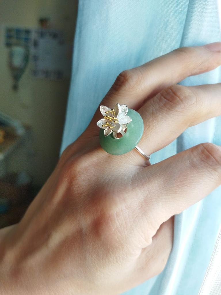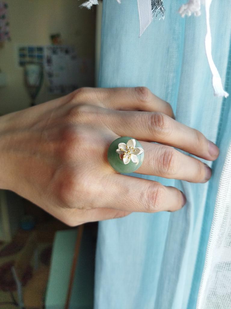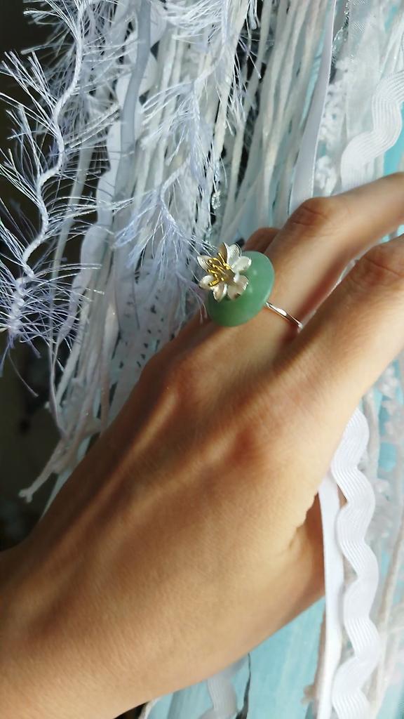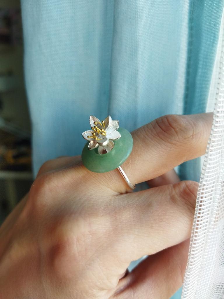 Колечко очаровательное) Искусная, изящная работа) Нежный лепесток лотоса едва касается зелёного листа. Очень красиво. Теперь хотелось бы весь комплект : и серьги и кулон.. камушек я поняла что это зелёный авантюрин. Я просто млею от такой красоты!!!! Украшения этой марки мне очень нравятся) хочу в этом магазине прям все! Огромный выбор очаровательных, стильных украшений! Спасибо огромное, за эту радость, Колечко регулируемое , цветочек из серебра, тычинки позолочены. К украшению сертификат подлинности камня не прилагался, но думаю что этот ювелирный магазин не стал бы обманывать . В прошлый раз заказывала у них серьги из лабродарита, сертификат прикладывали. На этот раз добавили салфетку. Коробочка из крафт картона с цветком на крышке .