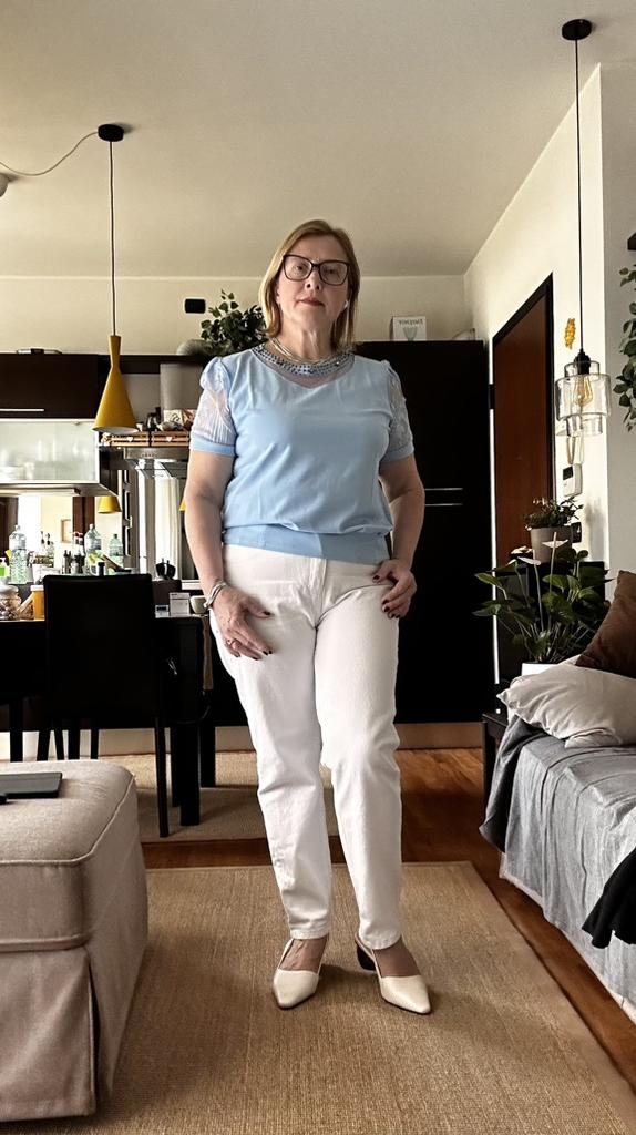 Голубая нарядная блузка, обошлась в 838 ₽. Немного темнее чем на фото. Размер XXXL подойдёт на обхват груди 98-102 см, не больше. На мой 110-112 см стягивает. Ещё и на рост 174 см оказалась короткой, талию еле покрывает. В общем, на мой 56 российский размер мала. Подойдёт только на 48-52 (на 48 российский сядет свободно, а на 52 - в самый раз). Ещё и ткань - плотная шершавая синтетика, плохо пропускает воздух. Так как фасон нарядный, то отлично подойдёт на выход с юбкой или джинсами, или для офиса (если там нет строгого дресс-кода). Для повседневной носки не годится. Может быть со временем похудею, дак смогу носить, а пока валяется без дела. Так что, если у вас размер больше 52 и рост выше 165 см - проходите мимо, ткань практически не тянется и сама блузка короткая.