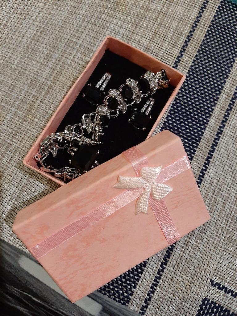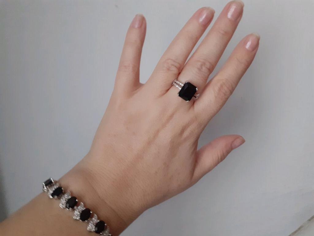 Хочу сказать огромное спасибо продавцу за этот чудесный комплект! Пришел заказ очень быстро- меньше двух недель с момента отправки! Комплект очень высокого качества- все как заявлено,работают все замочки,на браслете дополнительное звено на полную руку( я убрала),все кристалики на месте,камушки черные закреплены прочно- все это очень порадовало! Кольцо ( размер 8) подошло на средний палец.Р.S. Брала комплект за 1150руб,сейчас он со скидкой! Так что берите,не пожалеете! Я буду обязательно заказывать и другие комплекты ювелирной бижутерии у этого продавца!фо( фото не передает всей красоты и блеска- в реальности очень красиво!)