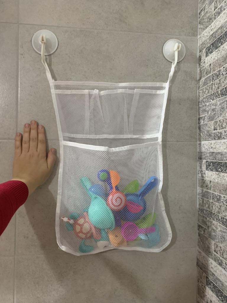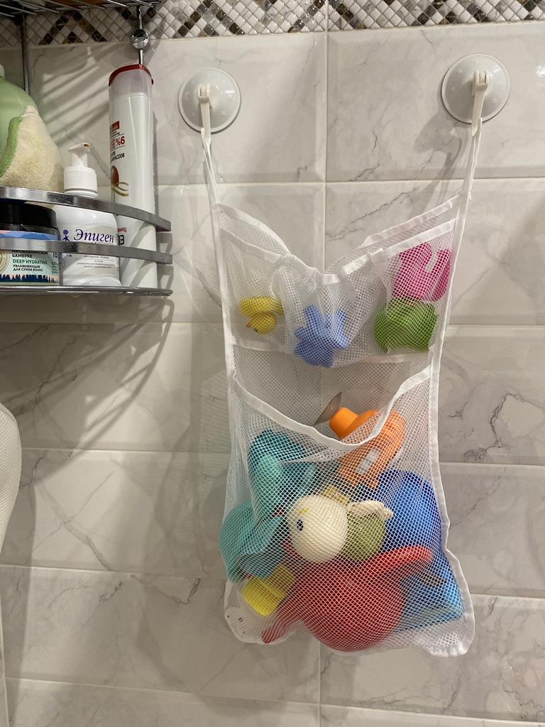 Отличный органайзер для ванных игрушек! 😍 Очень понравилось крепление, действительно надежное и крепкое. Это не просто обычные присоски, они закрепляются определенным образом (для этого вам нужно приложить круглое крепление к стене и опустить крючок вниз и готово!) У нас очень много игрушек для купания, и нам эта сеточка впритык, ещё лодка не поместилась. Но главное, что все мелочи теперь аккуратно сложены 👍👌🏻 Сначала сеточка попахивала, но я ее постирала вручную, и запах тут же исчез.
