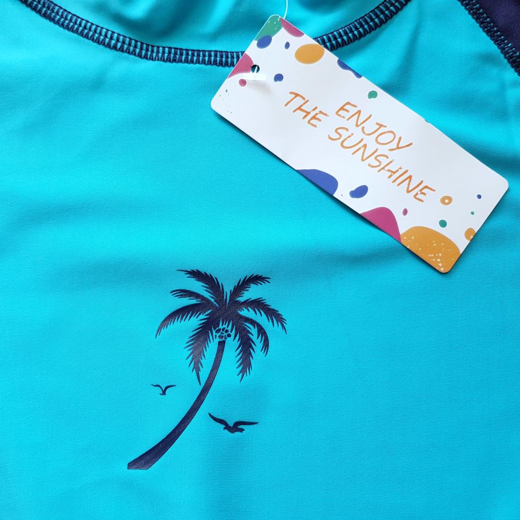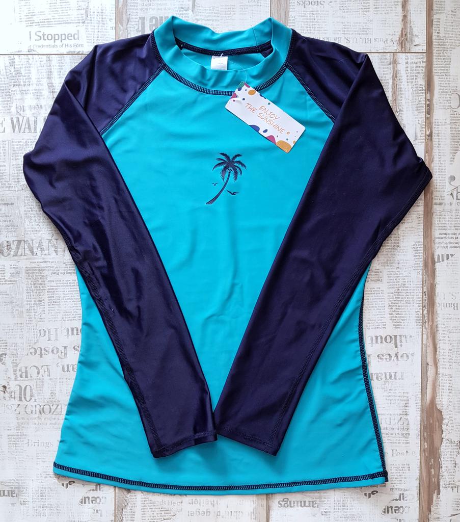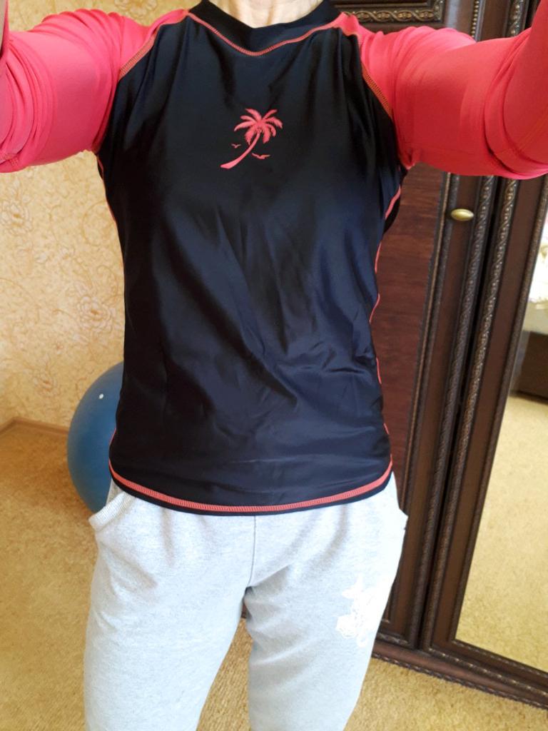 Мой идеальный топ для серфинга 🏄 Вторая и удачная попытка найти подходящую майку для серфинга 🙂 Вы только посмотрите как идеально сел на меня этот топ! Слегка приталенный крой подчеркивает талию. По росту и размеру попадание почти 100% 👏 А кроме того голубой и синий - мои цвета 😍 Я люблю не перегруженный дизайн и это как раз тот случай. Производители выбрали два цвета ткани для этой модели: для самого топа - небесный голубой и тёмно-синий для рукавов. От голубого я просто не могу оторвать глаз! Он очень яркий и заметный, а тёмно-синий контрастом подчеркивает его невероятный оттенок. Все строчки сделаны специальным трикотажным швом нитью в цвет рукавов. Единственное украшение на майке - маленький переводной рисунок - пальма с чайками. Очень милая и ненавязчивая деталь. На свои параметры 86-61-92 я выбрала S. Топ сел идеально на бедра и подошёл в груди с небольшим запасом. Я не люблю, когда одежда слишком в натяг, так что мне нравится. Для размера S продавец указал рост 160-165. Длина топа и рукавов на мои 163 см подошла, а для девушек повыше рукава будут короткими. У топа нет никаких дублирующих вставок с внутренней стороны, нет чашек на груди, а основная ткань хоть и плотная, но довольно тонкая. При этом ничего не просвечивает. В составе ткани есть полиэстер и спандекс, за счёт чего топ хорошо тянется. Топ доступен в шести разных расцветках и пяти размерах. Заходите в описание товара и внимательно читайте таблицу размеров перед покупкой. Обратите внимание ⚠️ Топ продается отдельно, низ в комплект не входит. ⭐⭐⭐⭐⭐
