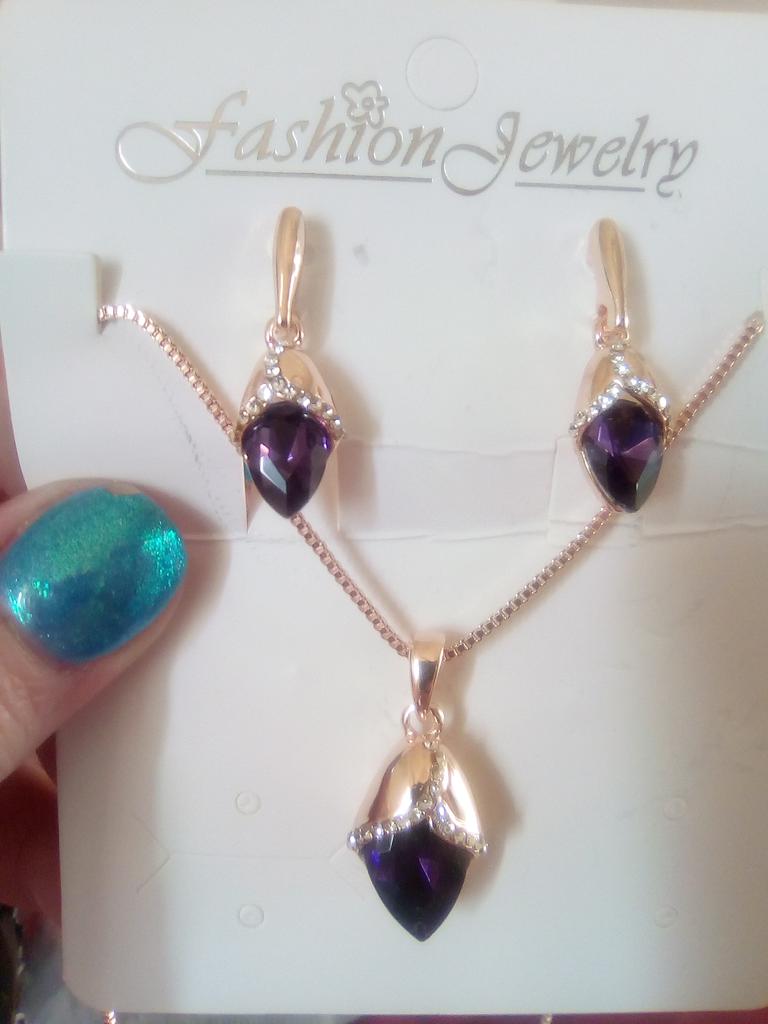 Комплект симпатичный, цвет камня светлый пурпур с игрой в розовый. Т.е. можно носить и с розовой блузкой, и с фиолетовой, будет смотреться. Цепочка понравилась, жаль если быстро потемнеет. Набор не выглядит дёшево. Единственный недостаток - обратная сторона кулона и серёжек сплошная. Металл благородного цвета. В целом, комплект производит приятное впечатление. Спасибо.