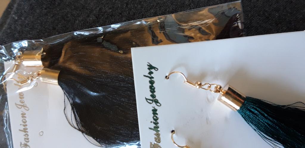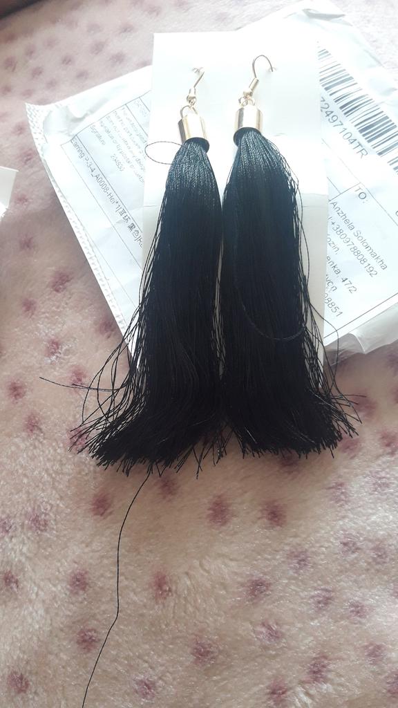 Серьги-кисти. Ставлю пять баллов и объясню почему. В целом претензий по качеству и упаковке нет. То что висят нитки и нижний край неровно обрезан- это поправимо. Достаточно связать пучок внизу и обрезать лезвием бритвы или резака. За 44 ₽ сделать это будет посильно)) Цвет кистей ровный, золотинка без ржавчины и все детали единого золотого оттенка- что уже хорошо. Нити из которых собраны серьги отливают атласным блеском . Также были опасения, что как говорится, будут стоять колом, но нет. Достаточно пластичные. Длина очень хорошая- ни убавить , ни прибавить. Заказывала изумрудные и чёрные- пришли в одном пакете. Продавцу спасибо!