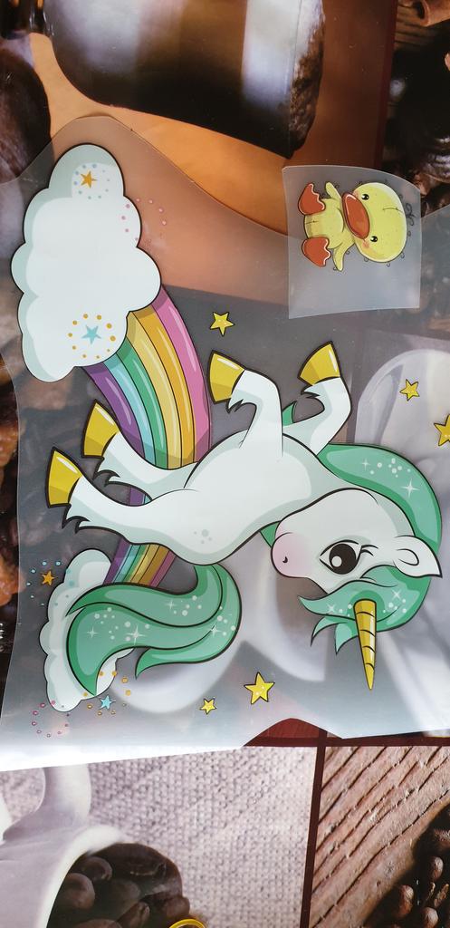 Классный большой единорог! Такого плана термотрансферы беру не в первый раз, в использовании все ок. Плотные, клеятся без проблем, при стирке не облазят.