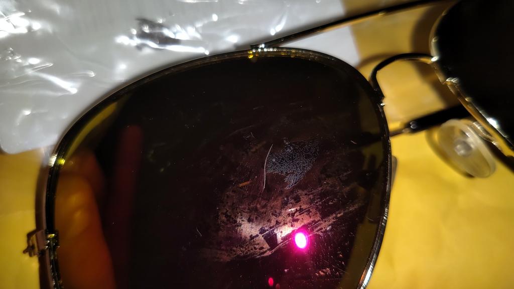 Очки пришли с повреждениями. В целлофановоМ пакетике, который упакован в пупырку, и в бумажный пакет. С внутренней стороны глубокая царапина. С наружной, небольшая потёртость, но она заметна. Это дешёвый товар, и по этому денег не жалко. Жалко 1.5 месяца ожидания.. Не даром есть поговорка: ДЕШЁВОЕ, ХОРОШИМ НЕ БЫВАЕТ! Из принципа буду требовать возврата денег. На фото выделены повреждения. P.S: Спасибо JOOM! Возврат денег одобрили через 2 минуты после сообщения. Дополняю: Через 2 дня сломался пластмассовый заушник. Деньги сразу вернули. Не советую покупать!
