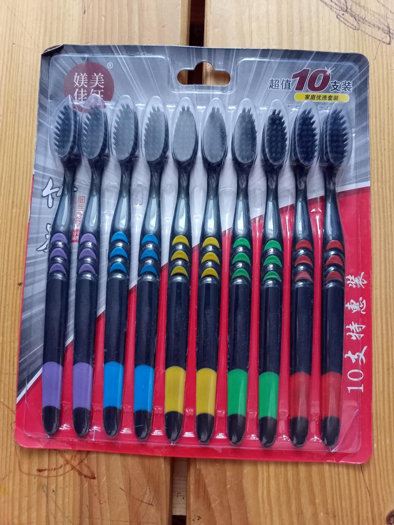 Читающий отзыв, приветствую тебя! Решила заказать мужу набор зубных щёток, чтобы можно было спокойно менять каждый месяц. В наборе 10 штук, получается, что 1 шт. стоит 24 рубля 60 коп. Вполне себе выгодно. Щётки идут парами и отличаются друг от друга цветами накладок на ручках. Пластик лёгкий, мягкий. Щетина мягкая и эластичная. Мужу щетина показалась мягковатой, мне же нормальной. Тут дело привычки. Чисти вполне неплохо, но из-за того, что ручка тонкая, щётка сильно прогибается и что не очень удобно. Наверное, такие зубные щётки больше подойдут для детей, так как благодаря гибкости и мягкой щетине не повредят дёсна, но при этом хорошо почитсят зубки.