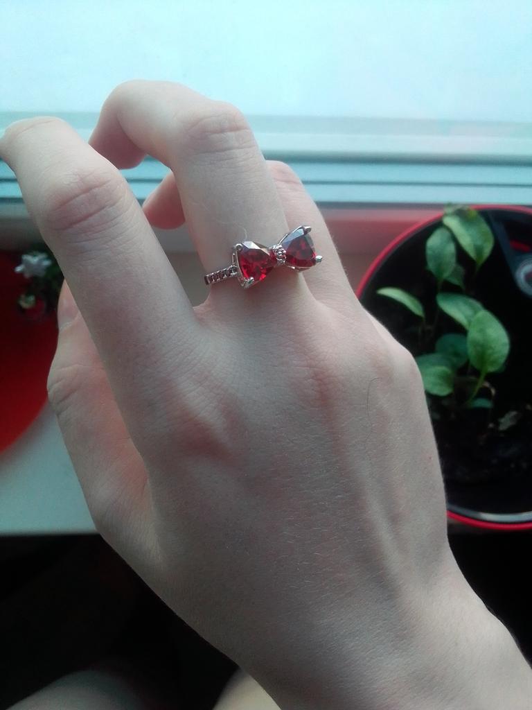 Милое необычное колечко) Очень ярко выделяется на пальцах. Дизайн отличается от фото продавца, нет красных камней на ободке и узелке бантика, но я готова это простить. Размер 8 соответствует 18. Доставка до Киева около трех недель. Мои рекомендации к покупке)