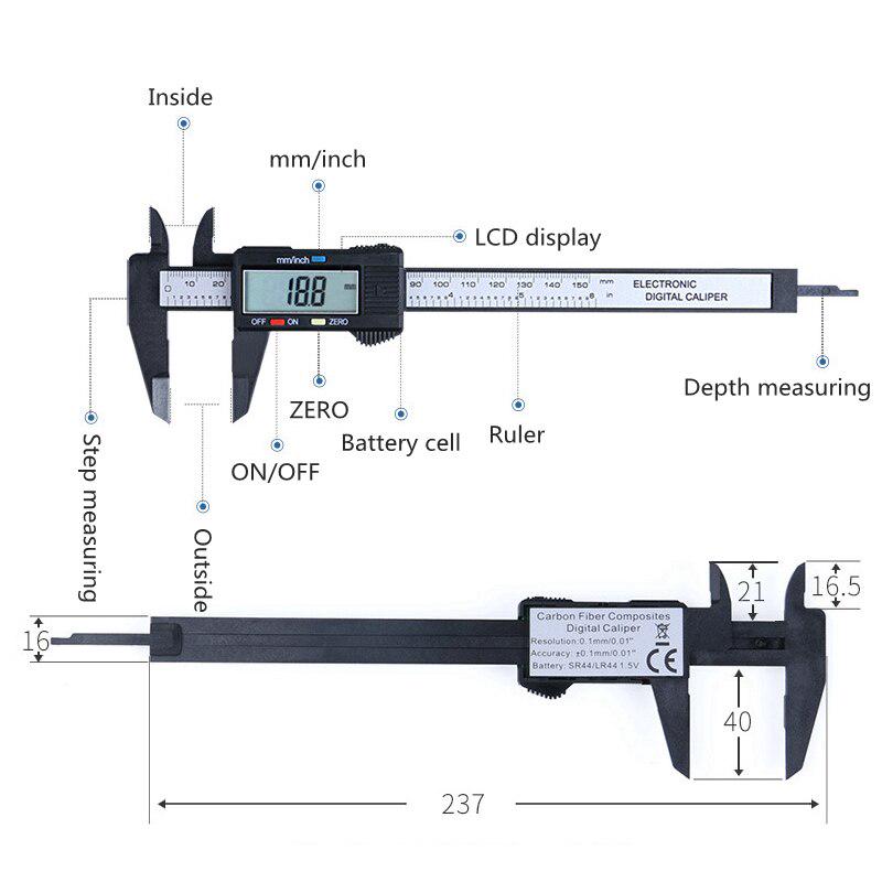 Цифровой суппорт Vernier 150 мм 6-дюймового ЖК-дисплея Черный углеродное волокно Микрометр 0,1 мм Цифровые суппорты Micrometro Paquimetro