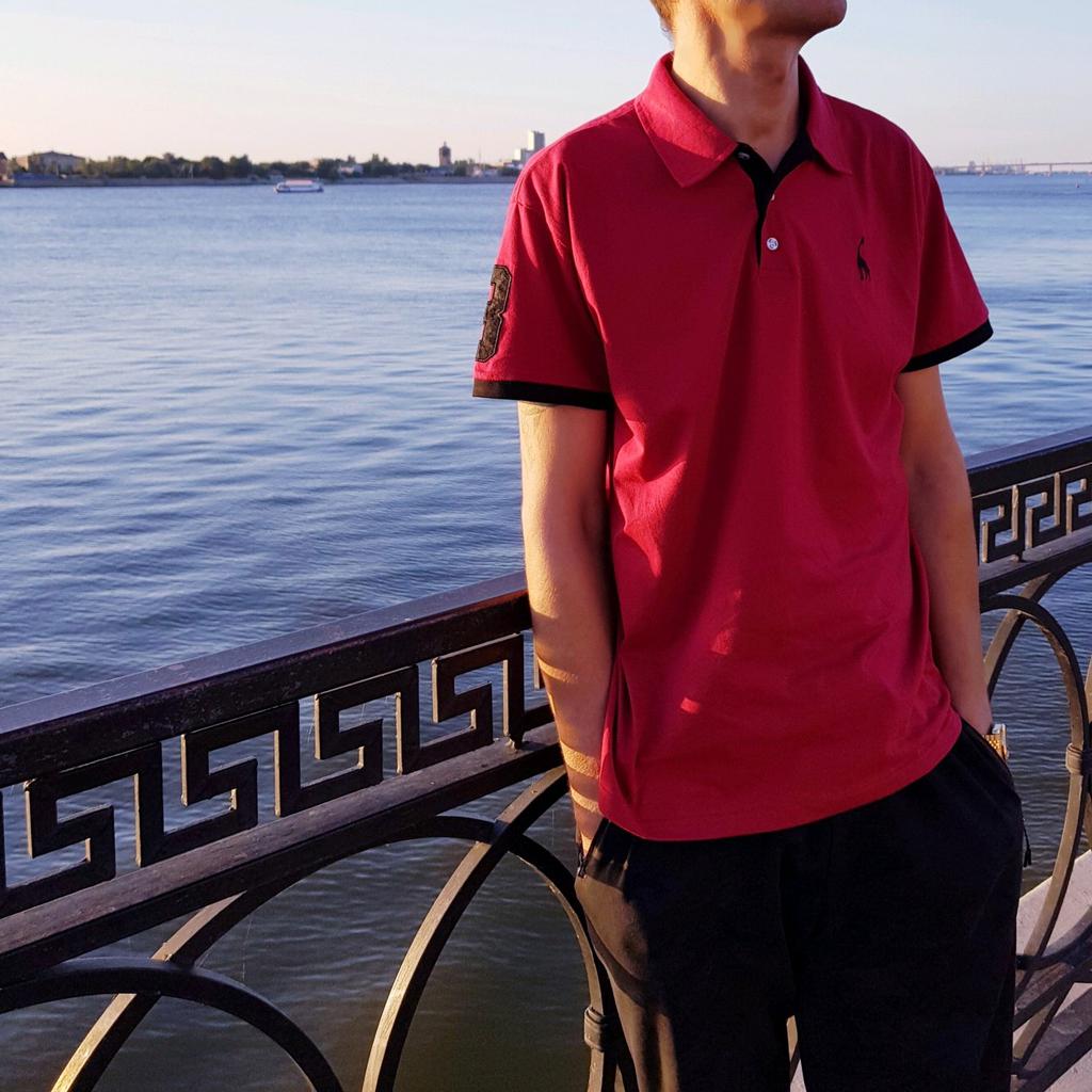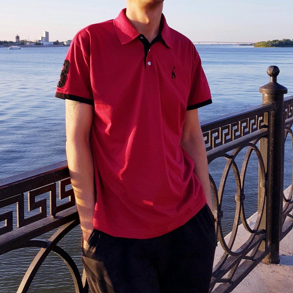 Еще одно отличное мужское поло. Футболок не бывает много))). У наших драгоценных мужчин не так много возможностей модничать, как у нас. Зато можно разнообразить скудный мужской гардероб приятными расцветками. Это поло идет в шестнадцати вариантах цвета!!! Есть из чего выбрать). Тем более качество тут хорошее, классическая форма, которая подходит абсолютно ко всему, и приятная легкая ткань, как раз на лето. Буду советовать! Фасон тут самый обыкновенный. Крой прямой, отложной воротничок, планка с пуговицами, короткий рукав. Из украшений - уже знакомая вышивка в виде жирафа на груди и нашивка на рукаве. Тройка. Я выбрала мужу красное поло. По факту цвет скорее бордо, или яркая вишня. Цвет оказался очень капризный для фото, но общий смысл все таки передать удалось. Очень приятный оттенок, и не банальный. Ткань не просвечивает, мягкая, по составу хлопок стопроцентный, сомнений нет. Пошив в общем-то аккуратный, только с изнанки обнаружилось немного торчащих ниточек. Размерная таблица от S до XXXL. Измерения в описании верные, взяла мужу XXL, получилось как раз. Итог. Вещь хороша, цена приятная. Поэтому стоит взять. У меня все).
