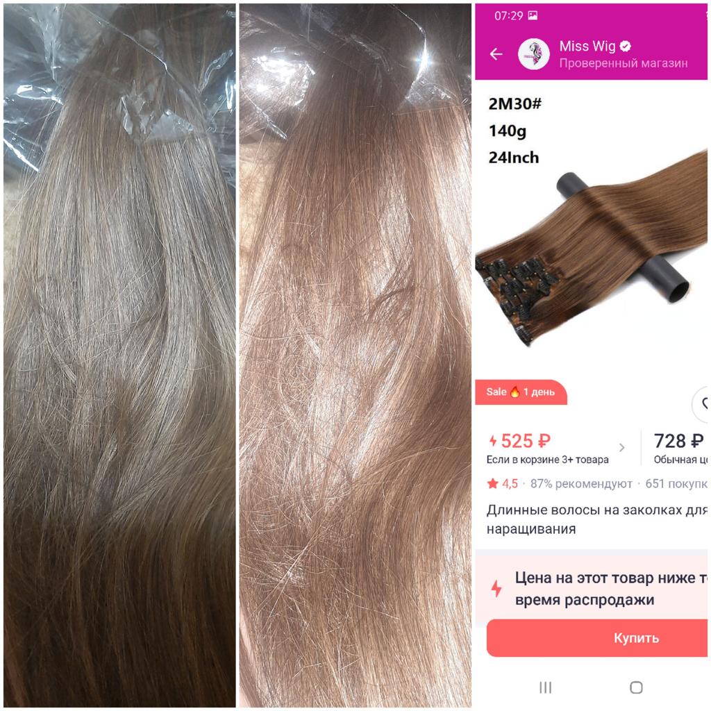 2М30# русый цвет, на фото более рыжеватый. В деле холодный русый цвет. 1 из 3 заказов. 2М33# бордово-рыжий, холодный. Цвета вообще не стреляют. Сами волосы нормальные, блестящие, гладкие, тяжелые. Попалось 2 одинаковых из 3 наборов. Хотя вроде разные выбирала. Держаться хорошо, если не трогать (не расчесывать). Придется подбирать теперь краску для и так обпаленных волос🤦🏼♀️ И подстраиваться под темный оттенок, т.к. 2 набора. Русые придется продавать. На фото волосы со вспышкой и без. Цвет 2М33# коричневый с фиолетовым оттенком. А 2М30# русый с мелированными черными волосками, цвет тоже холодный.