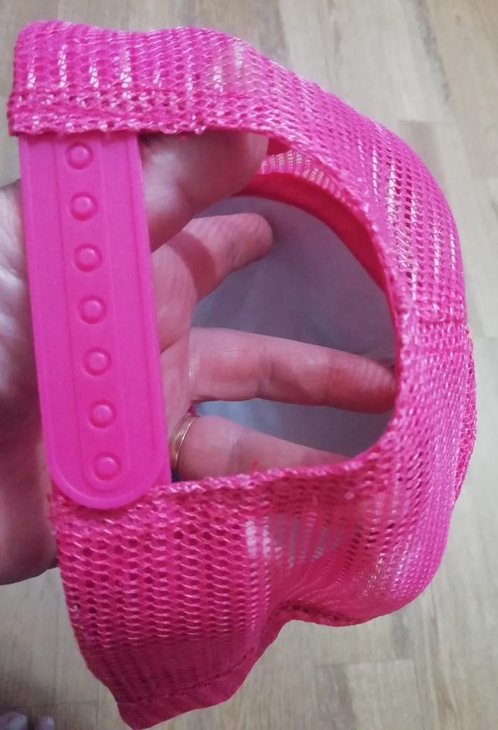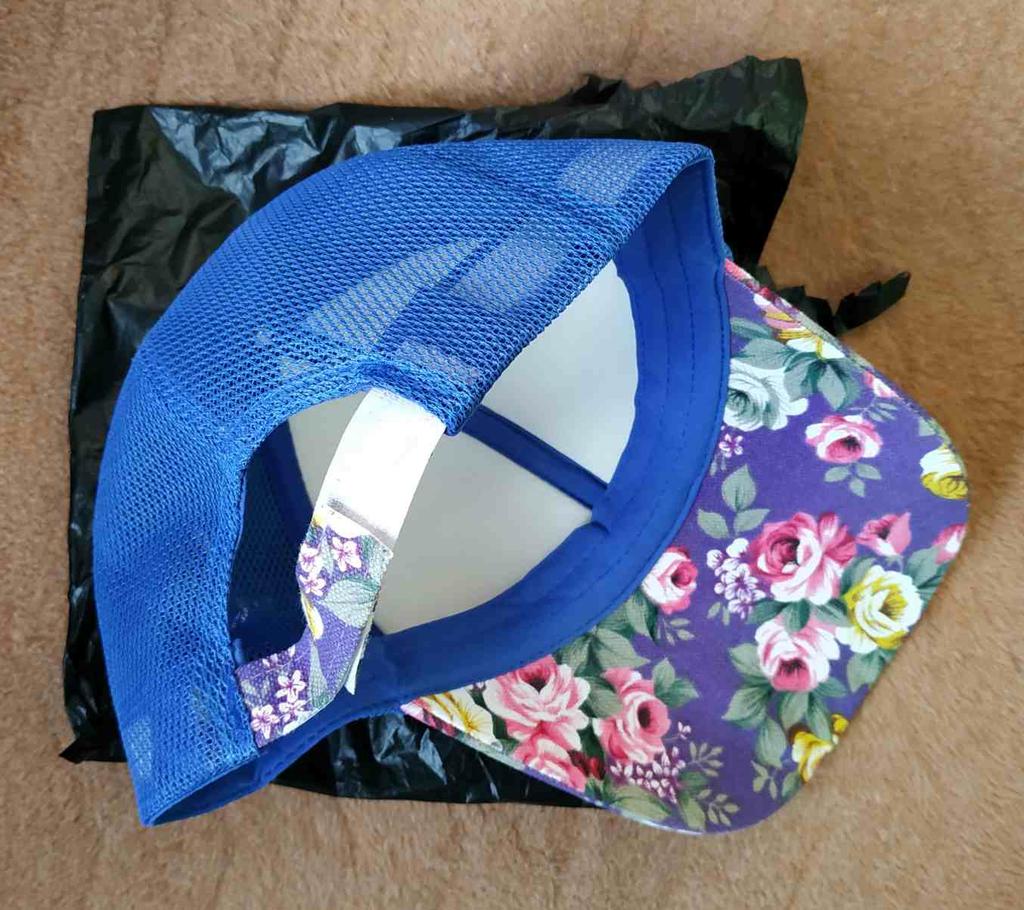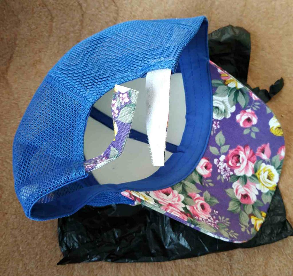 Часть в цветочек жёсткая, сетчатая часть мягкая синего цвета. Очень длинный козырёк, но сама кепка мелкая, ушей не закрывает (достаёт до верхнего края). Регулировка объёма головы производится тесёмками на липучках. На фото 3 они "выставлены" на мою большую голову 58-го размера. Так что, очевидно, кепка на голове меньшей, чем у меня, будет сидеть лучше. Вторая половина прошедшего лета была очень жаркой, очень хотелось на улице прикрыть голову, чтобы не напекло. Но заказывать было уже поздно. Поэтому запаслась на следующее лето. Теперь оно точно будет холодным и дождливым. :)