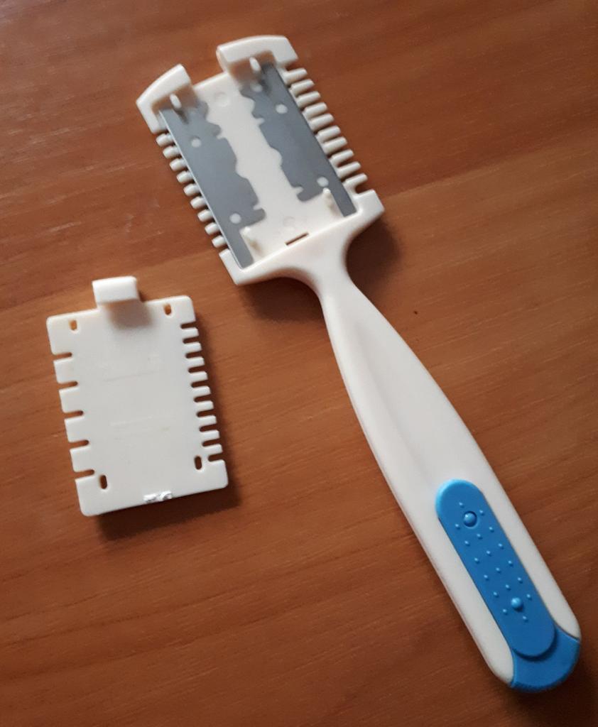 Чтобы поставить лезвие в триммер, надо сначала его разрезать пополам , потом его укоротить, тк лезвие длиннее, чем триммер. Триммер мелкий, стричь не очень удобно