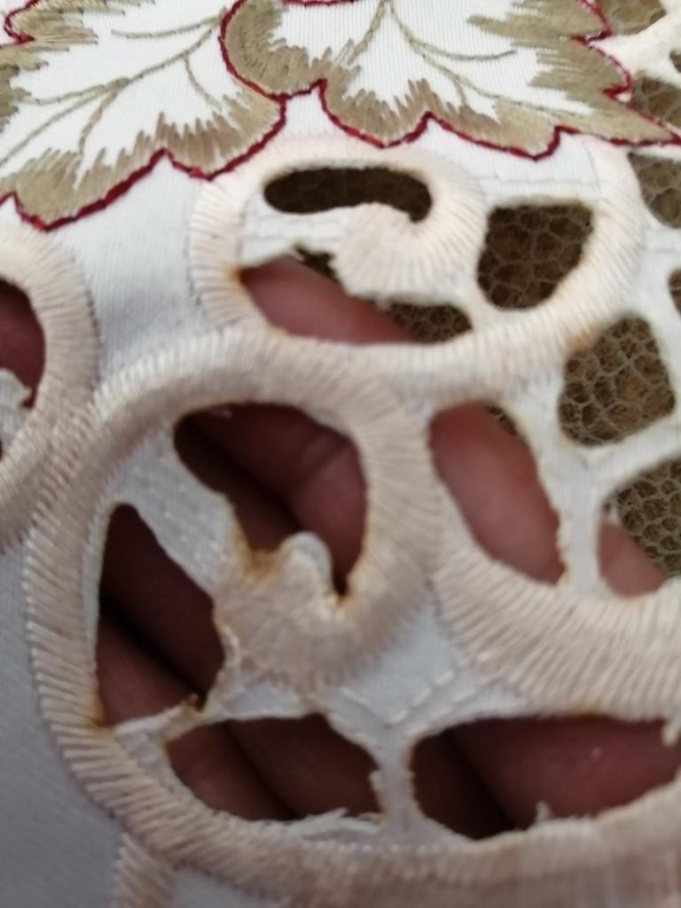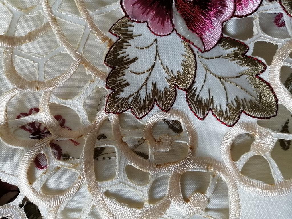 Салфетка пришла вся мятая, свернута в ком. Но быстро разровнялась. Поглажу, будет супер! Ткань плотная. Вышивка качественная. В некоторых местах нужно немного поработать ножничками. Но это не критично. Рекомендую!