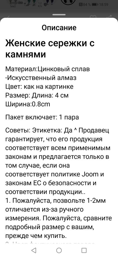 Здравствуйте! Заказ получила. Пришёл быстро. Серьги не подходят по размеру, как в описании. Там нет 4-х сантиметров, как обещано. Фиксатор был только один, да и тот без дырочки!!! Так что носить их нет возможности!!!😭 Как правило раньше даже запасной присылали!!! 🤷♀️ Покупкой расстроена!!!!! 🤦♀️ С уважением, Татьяна. P. S. В посылке было 15 товаров вместе, что ОЧЕНЬ удобно и порадовало!!! Спасибо, Joom!!! 🌹