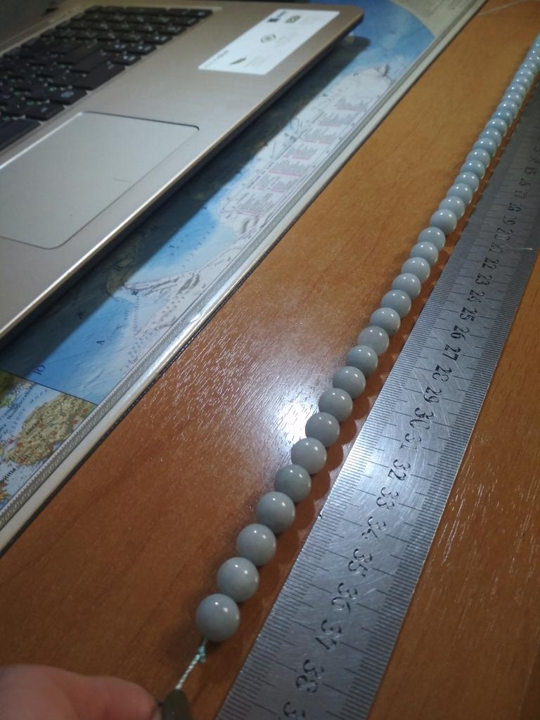 Заказ шел 1,5мес в Караганду. Пришли бусины на нитке в общей посылке, трек частично не отслеживался. Заявлено 36 бусин по 10мм. Пришло 38 шт бусин что составляет 38см, спасибо продавцу! Хотела снять звезду за цвет, но не буду этого делать, т.к. бусин 38шт и качество бусин отличное, такие гладенькие, ровненькие, приятно держать в руках. Кстати, цвет светло-серый с голубизной))).