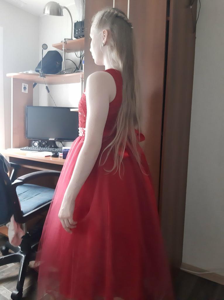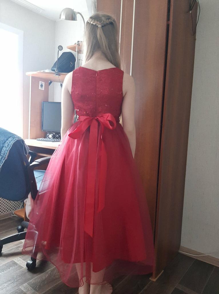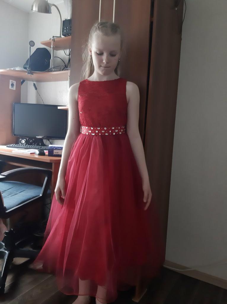 Красивое, юбка пышная, многослойная, пояс с камнями отдельно. Единственное, талия могла быть чуть пониже. Брали с запасом в 1 год на 11-12 лет, в груди прям впритык.