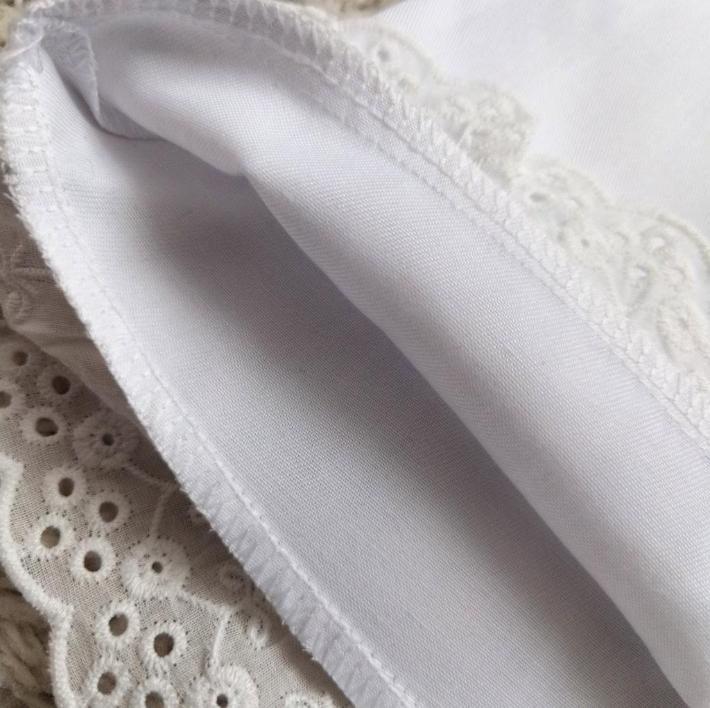 Милое платьишко. Ткань чем то похожа на тонкую белую джинсовку. Очень понравилось, хотя и прошва не белая, а с желтизной, но видимо такая задумка была у дизайнера. Спасибо продавцу и сайту.