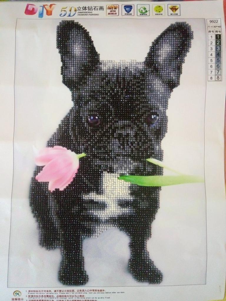 Алмазная вышивка Разве не прелесть этот бульдожка💗 Обожаю собак😍 Заказала по просьбе дочки, вместе с ней и делали. Собственно два дня мы на это потратили. Все легко и понятно по схеме. На видео мой ребёнок делает самостоятельно. Бисера в наличии с запасом, у нас много осталось лишнего. Выкладка не полная, глаза, цветок и сам фон делать не нужно, а жаль, мне кажется ещё лучше смотрелось бы... Но и так результатом довольна! Доставка в течение трёх недель. Покупала за 338 руб.