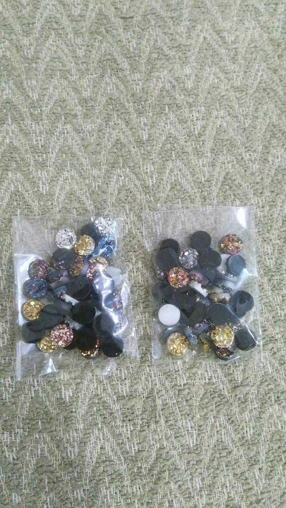 Заказ пришёл в 2х пакетиках. По колличеству больше заявленых 80. В олном 43, в другом 42, 5 бонусных штук. Камушки красивые, переливаются. Напоминают естественный кристалл, не плоские. Что опечалило, так это отсутствие светло-розового оттенка (на него была задумка), в заказ положили больше синих. Посмотрим, может розовые отдельно закажу, без микса.