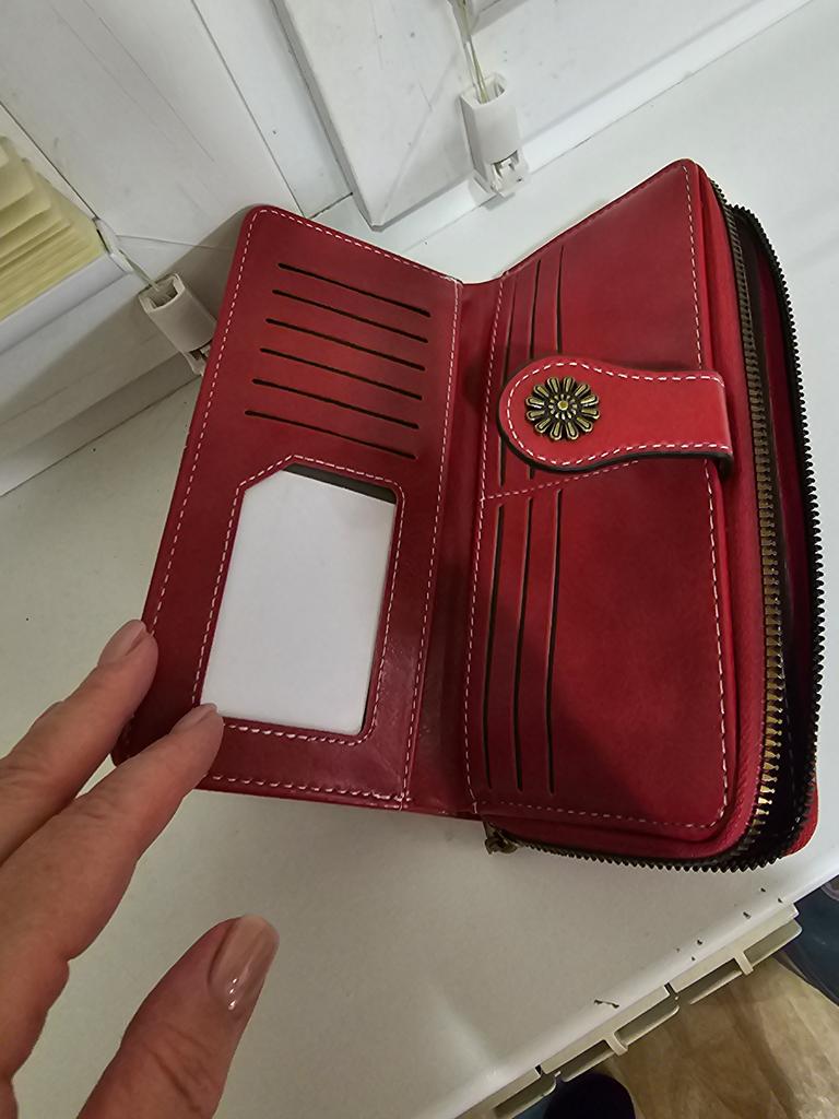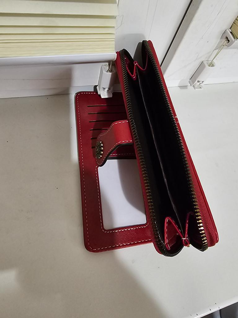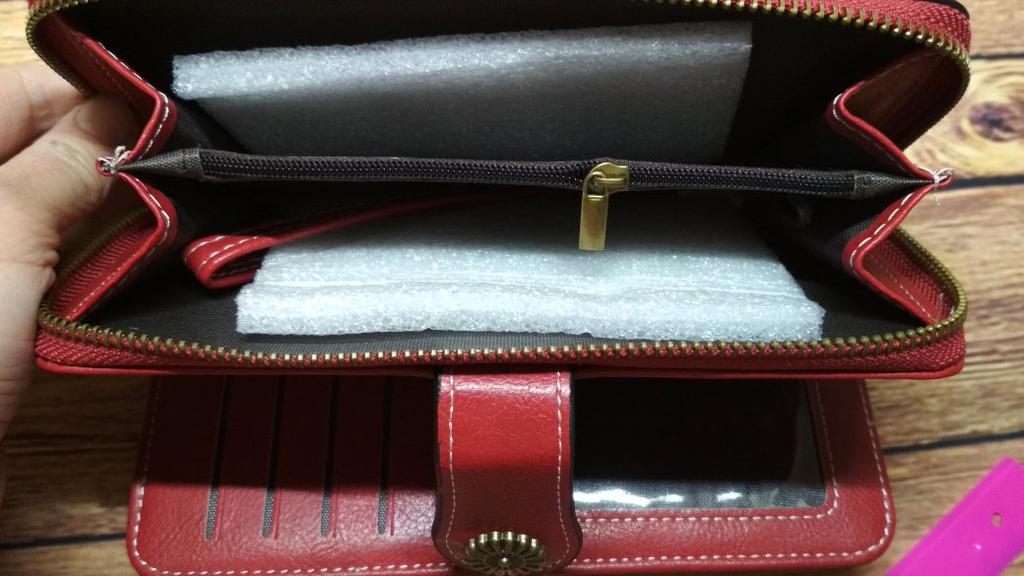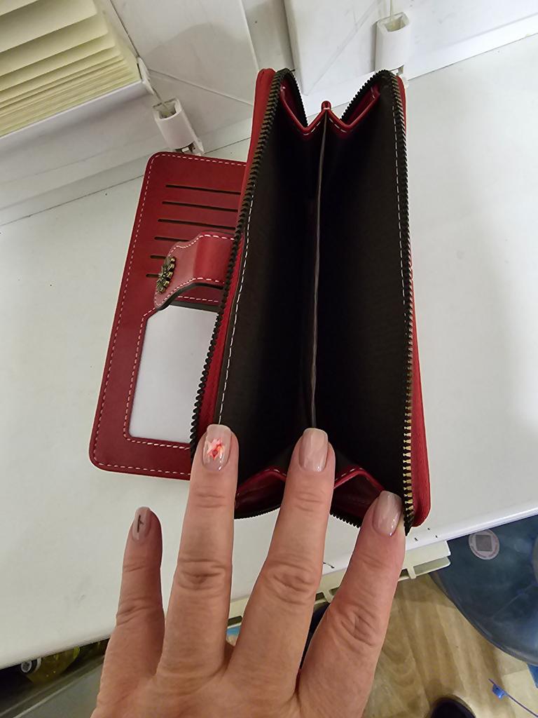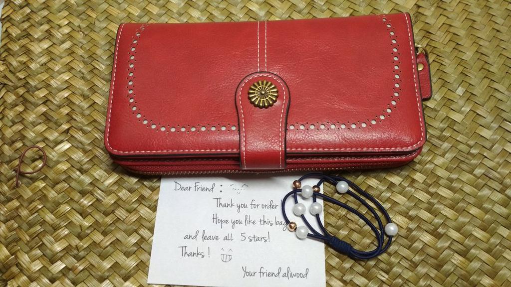 Женский кошелёк-клатч. Приобрела я его в подарок, но не показать вам, конечно же, не могу. Я сама кошельками подобного размера не пользуюсь, да и меньшего, признаться, тоже. В сумочке помещается всё необходимое, скидочные карточки с собой постоянно носить нет необходимости (у меня в смартфоне установлено приложение, где занесены данные всех карт, и на кассе я предъявляю смартфон со штрихкодом на экране). Карточка для безналичного расчёта засунута в чехол телефона (NFC-модуля у меня нет). Но вот такую вещь в руках подержала с большим удовольствием, и знаю, что подарку будут очень рады. Размеры кошелька – 19*9*4 см. Выглядит он даже не как кошелёк, а как маленький клатч. К нему даже приложено дополнение в виде ремешка-петли, с помощью которого кошелёк можно носить на кисти руки. Сам клатчик – великолепен. Начну с его внешней части. Думаю, что это не кожа, но материал хочется трогать и гладить рукой. Очень приятная текстура. Фурнитура – металлическая молния и кнопка под бронзу. Качественные, не выглядящие дёшево. Под молнией скрываются три кармашка для наличности, средний (разделительный, для мелочи) закрывается на пластиковую молнию. Тут тоже соблюдён общий стиль, бегунок – бронзового цвета. Отстегнув большую кнопку в виде бронзового многолепесткового цветка, видим ещё одно отделение. Пластиковое окошко, 13 кармашков для карточек или визиток. Под ними – ещё четыре кармана с боковым входом. Вот прям очень понравилось! Размер клатча позволяет положить в него смартфон любого известного мне размера. Выполнено всё очень качественно, снаружи – декоративные перфорация и контрастная отстрочка. Упакован кошелёк был очень хорошо, во внутренних отделениях проложены вставки из вспененного материала. Я, конечно же, рекомендую вам эту замечательную вещь. Продавец (магазин aliwood) предлагает пять вариантов расцветки. Мой кошелёк – винный красный. Цена для такого подарка, считаю, вполне умеренная. Доставлено за две недели. И да, в подарок была приложена красивая резинка для волос с бусинками, а также письмо от продавца с благодарностью за заказ и выражением надежды, что товар понравится и я поставлю ему пять звёзд. Что я с удовольствием и делаю, поблагодарив продавца!
