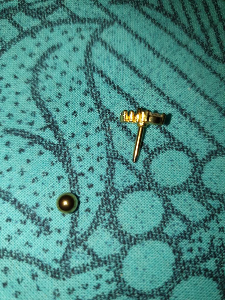 Серёжка красивая, камушки на месте. Но как видно изделие неровное. Когда надеваю в хрящ, то неприятно царапает( Так - то откручивается с двух сторон. Я один раз раскрутила со стороны камушка и даже закрутила, а повторить уже не смогла((( Видимо заклинило из-за неровности( Толи в дороге помялась, толи заводской брак, не понятно 🤷♀️