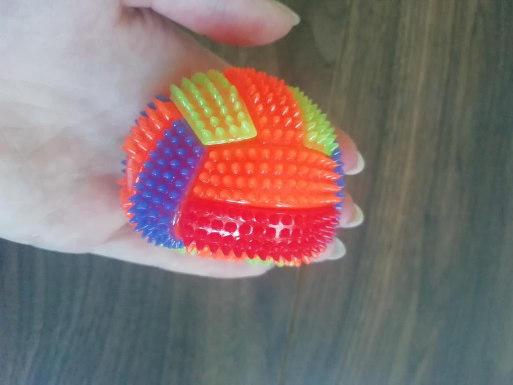 Доставка была около месяца Упакован был в несколько мягких пакетов, но не смотря на это был деформирован Брала самый большой размер, но для годовалой немецкой овчарки все равно очень маленький Пищал очень громко, да так что собака из коридора прибежала в комнату выпрашивать свою игрушку😆 Светился ярко Заказчик был доволен до тех пор пока не прокусила саму пищалку, потом мячик перестал так хорошо прыгать и получилось прокусить ещё и мигающую часть... Потом шар ей разонравился
