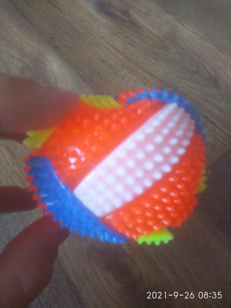 Пропустила в описании, что он мягкий (не жёсткий, не массажный) и звучит при сжимании (довольно противно), поэтому была возмущена. Потом перечитала описание внимательно. Выходит, я не права, поскольку описанию соответствует полностью. Почему он мне выпал, когда я искала массажный мячик - уже другой вопрос. Отдала племяннику.
