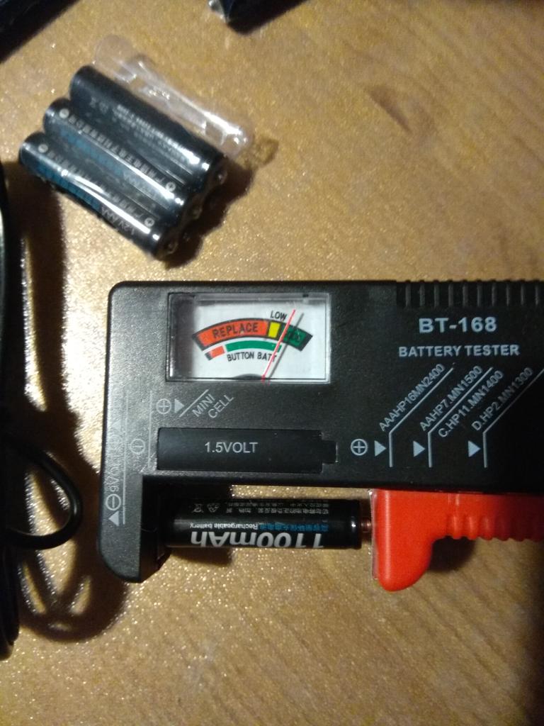 Пришли ААА, V= 1,56в. Но первые 2 шт без проверки поставил на зарядку, горели красные лампочки, через час снял и проверил- 1.92в!
