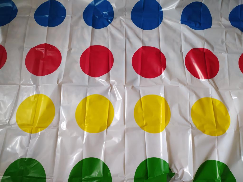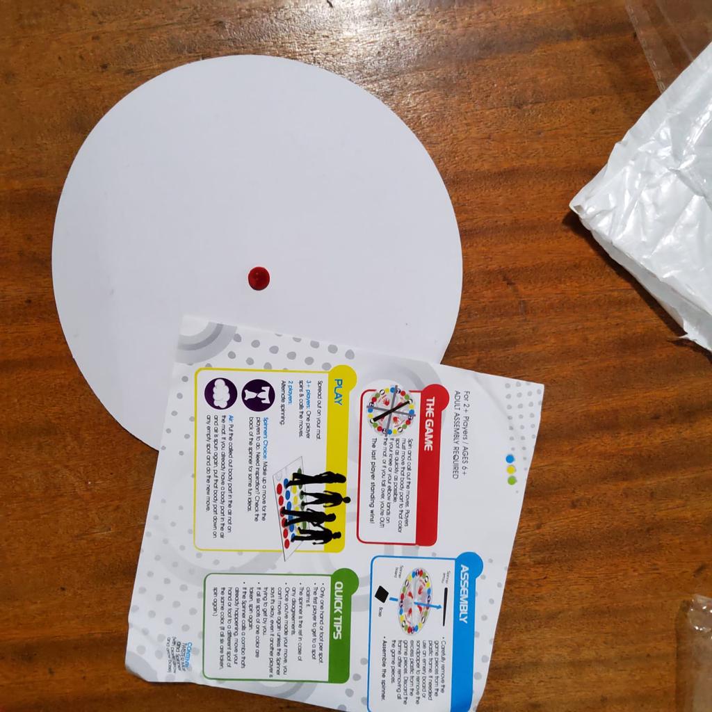 Игрушка что надо, можно играть и вместе с детьми родителям. Размер полотна 114 см на 160 см, выполнен из клеенки, с нарисованными кругами. Круги не пачкают. Циферблат со стрелкой уже собран. Циферблат поделен на 4 сектора с указанием правых и левых рук и ног и цветными кружками. В каждом секторе по 2 фиолетовых кружка, один с облаком- пропускаешь ход, а другой выбор ведущего. Попробуйте очень весело. Есть инструкция на английском. Рекомендую