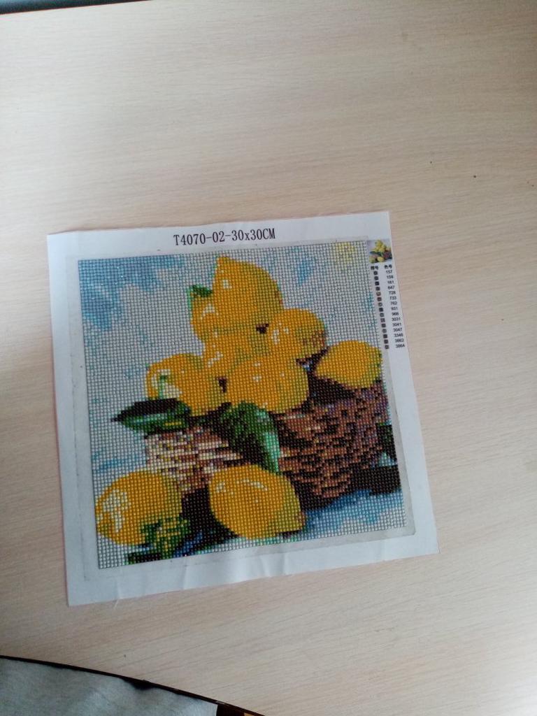 Товар получила, все в комплекте. Довольно быстро пришла посылка. Минус звезда за то что вводят в заблуждение покупателя относительно размера. Фактический размер полотна без белого поля 25х25. И схема выкладки очень не удобная, глаза сломаешь (видно на фото) . Сверху плотная бумага, а не прозрачная пленка, что тоже не очень удобно при работе. 15 цветов, некоторых стразиков очень мало в мешочке кажется не хватит, но посмотрим, за ранее не буду наговаривать. Вкладка полная. Будет результат- дополню. Дополняю. Мозаику закончила. Не хватило основного желтого цвета штук 30 наверное стразиков. Все остальные цвета понемногу остались. Поэтому вышла из положения используя их.