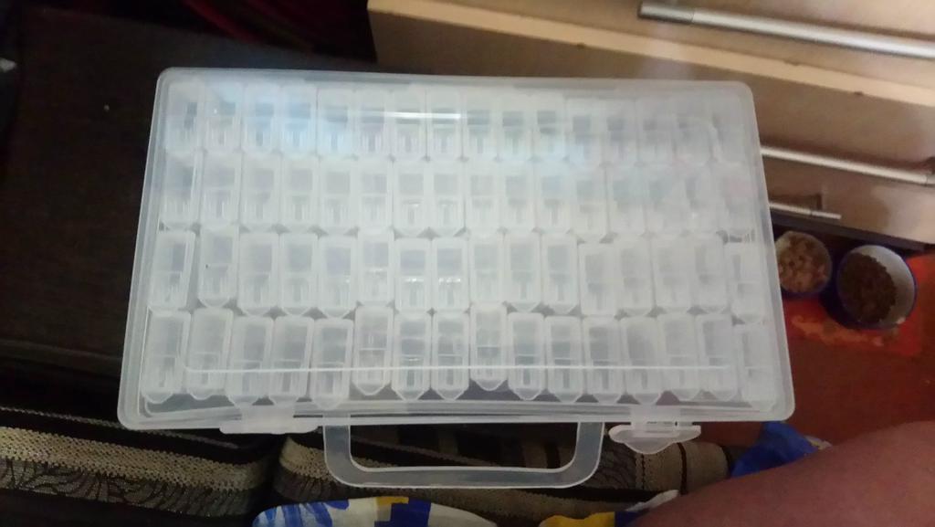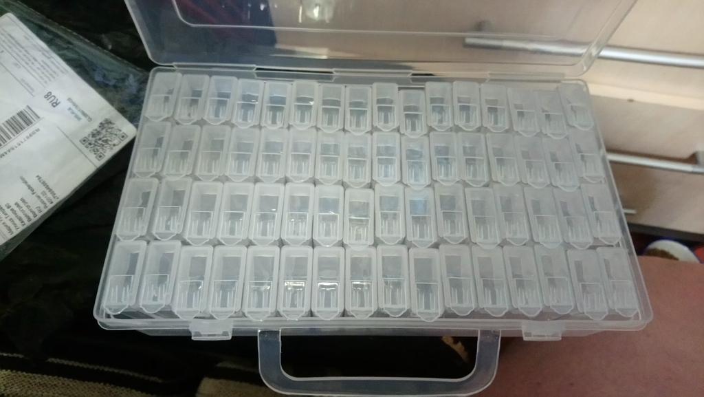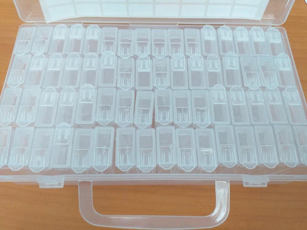 Коробочка маленькая. В ней 64 маленьких контейнера. Все в целости. Закрывается, открывается. Спасибо. Дочка разложила все оставшиеся стразики по коробочкам и даже не хватило контейнеров) очень много разных оттенков.