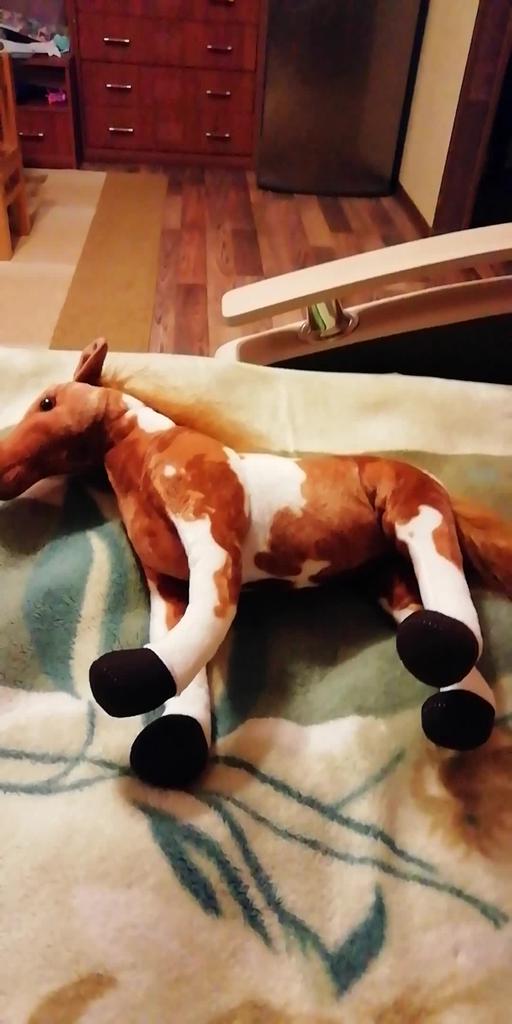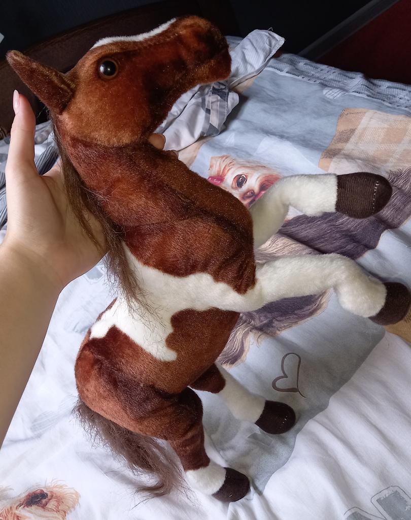 Брала ребёнку на подарок. Ребёнок в восторге. Лошадь на проволоке, может стоять. Запаха нет. Сшито хорошо. Немного удивлённая морда у лошади. Спасибо продавцу. Рекомендую