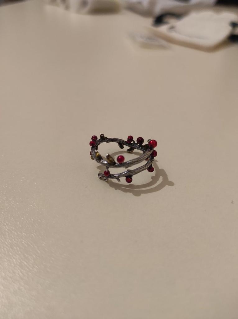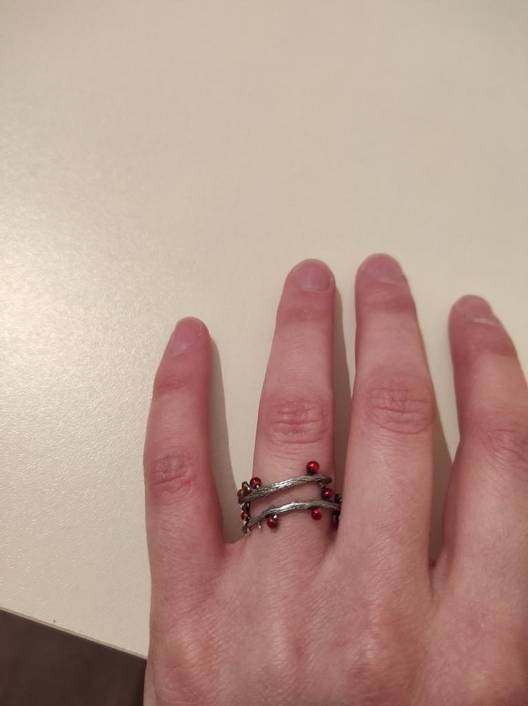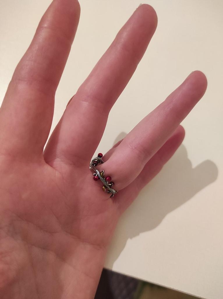 Получила кольцо. Доставка 58 дней от заказа до почтового отделения, довольно долго. Упаковано в пупырчатый пакет, есть подарочный мешочек, доехало целым. Теперь по самому кольцу. Честно говоря я разочарована. Во первых оно довольно мягенькое, слишком. Если сжать что то в руках, деформируется... Заказывала подобное от бемор змейку, она лучше держит форму. Во вторых, оно царапается на руке, и очень цепляется за одежду. Ну, это было ожидаемо, так что за это звёзд не снимаю, но самое главное, эти листики и ягодки, неоднородны и несимметричны, что тоже понятно, имитируют природу, но беда в том что "залысина" приходятся как раз на верхнюю часть кольца, где наоборот должно быть красиво, зато богато украшено между пальцами... Я так понимаю, мне не повезло, именно так отрезали от общего куска "проволки". Но вся прелесть кольца между пальцами, а сверху лысые ветки. Поэтому 2 звёзды.