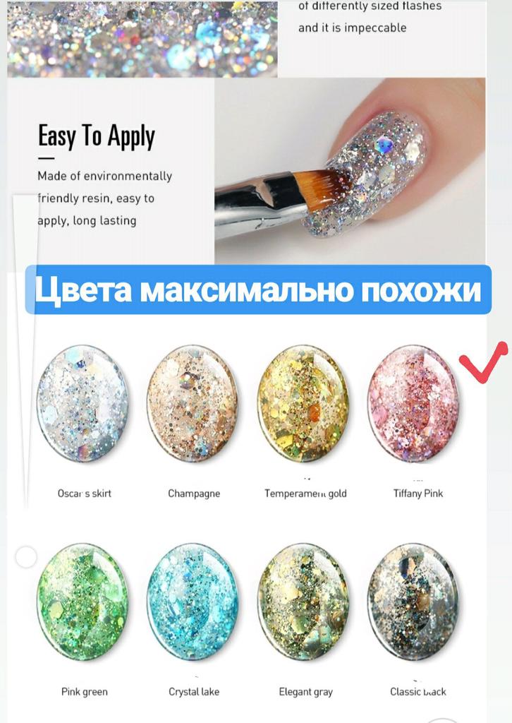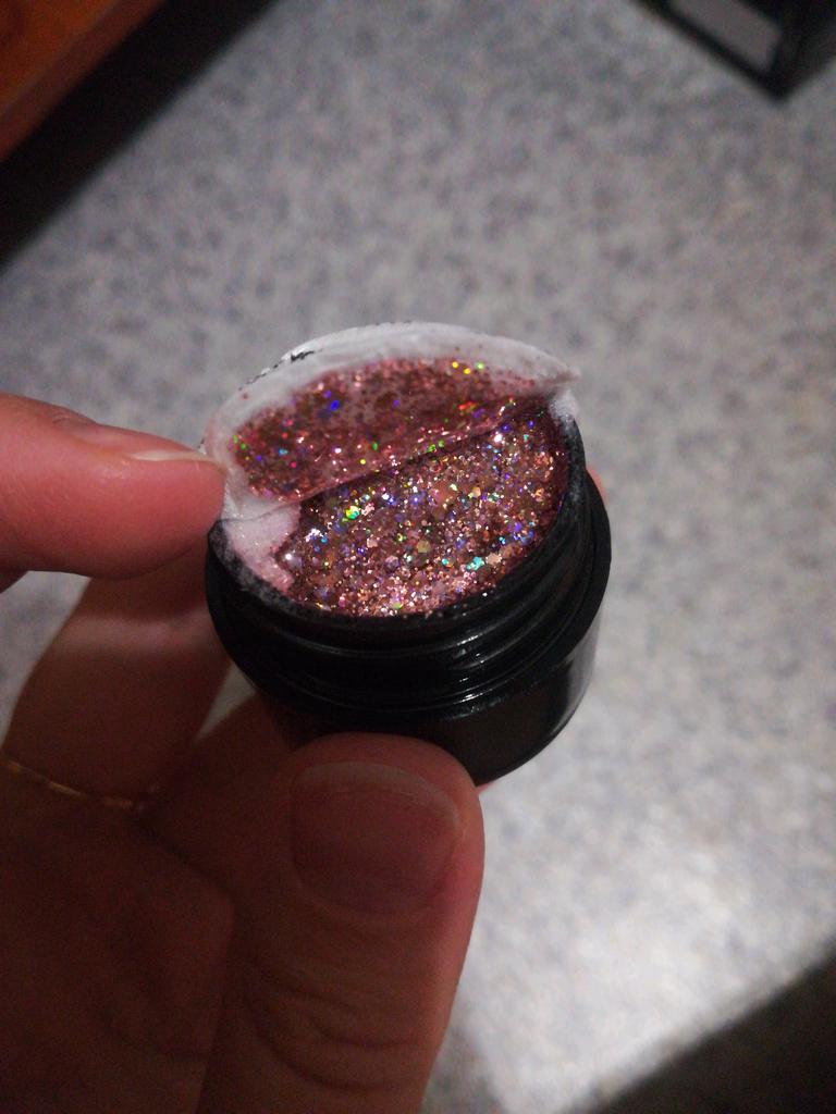 Оплатила 30.11, пришёл 4.01, из-за праздников забрала 10.01. Баночка маленькая, не полная, но большой объем и не обещали)) Очень круто блестит! К НГ было бы самое то... Дополняю. Сделала выкраску. Основа прозрачная бесцветная, но много мелких розовых блесток, что делает общий фон розовым. Ещё есть голографические блёстки, мелкие круглые и средние ромбические камифубуки. Основа не густая. Ложится сносно, особо не ползает по типсе. Будет хорошо смотреться с большинством нюдовых розовых и сиреневые оттенков. На видео с топом, так как есть небольшой остаточный липкий слой и необходимо лёгкое выравнивание. Мне нравится, позже буду заказывать и остальные цвета.