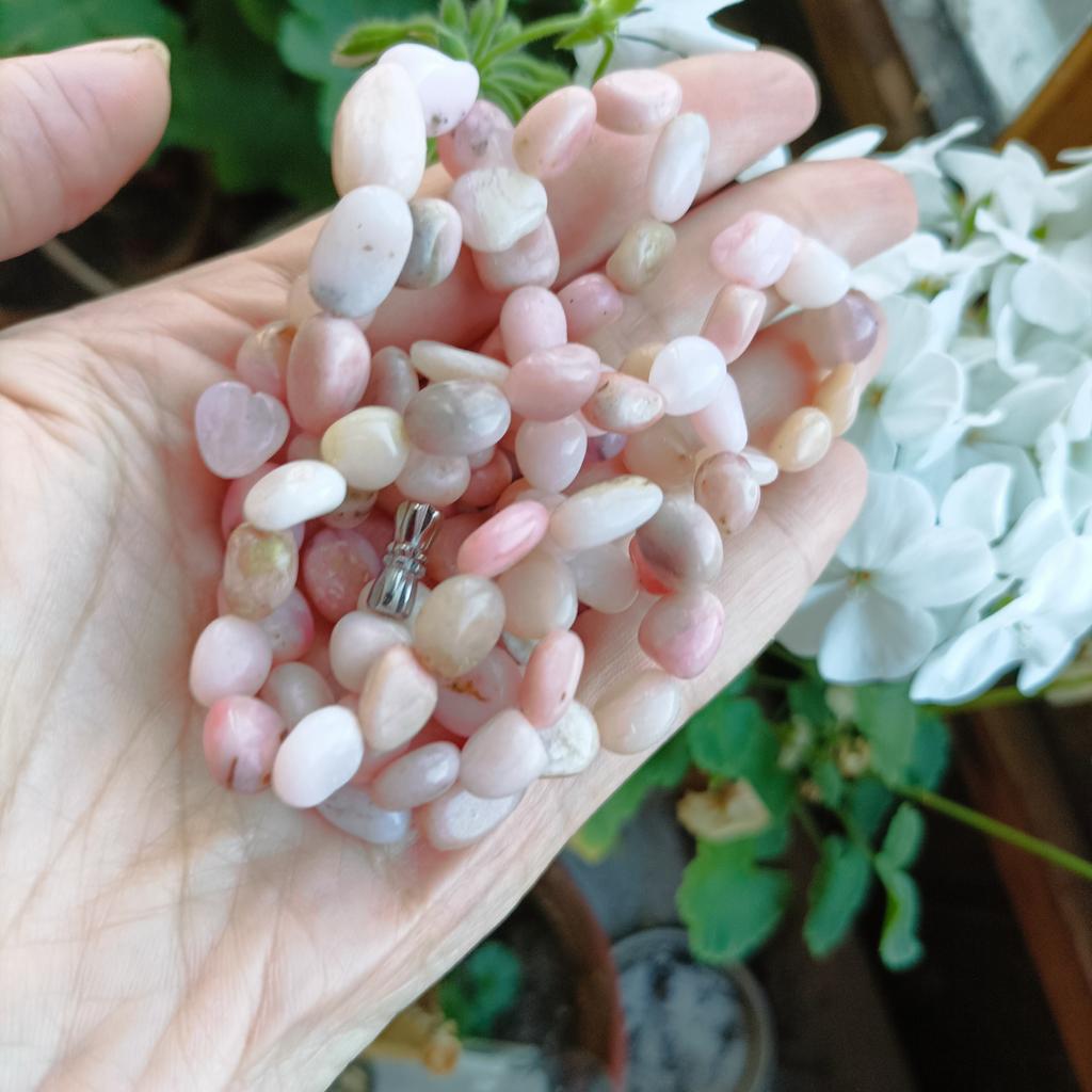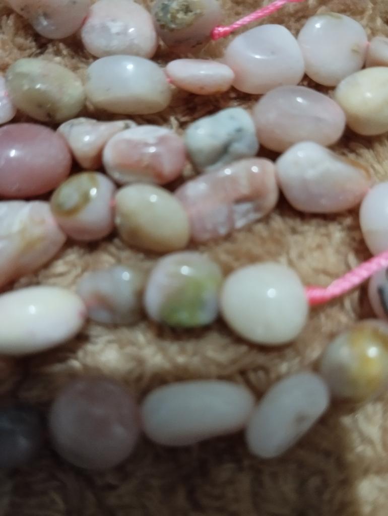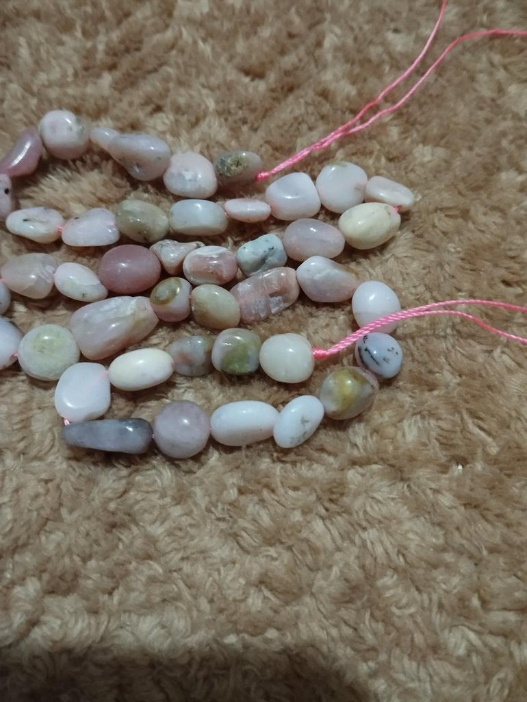 Просто милые розовые камушки. Так сначала показалось. Когда занялась сортировкой - была покорена прелестью настолько, что ни одного не забраковала. Собрала а бусы - все идеальны, даже с вкраплениями. Полезла в гугл и расстроилась - нет таких опалов. Все опалесцируют, более яркие, красивые. И я набрала просто: розовые опалы. Узнаваемы сразу. Месторождение - Перу. Один в один, и они прекрасны. Но сейчас на Озоне можно купить дешевле, и там есть выбор размера.